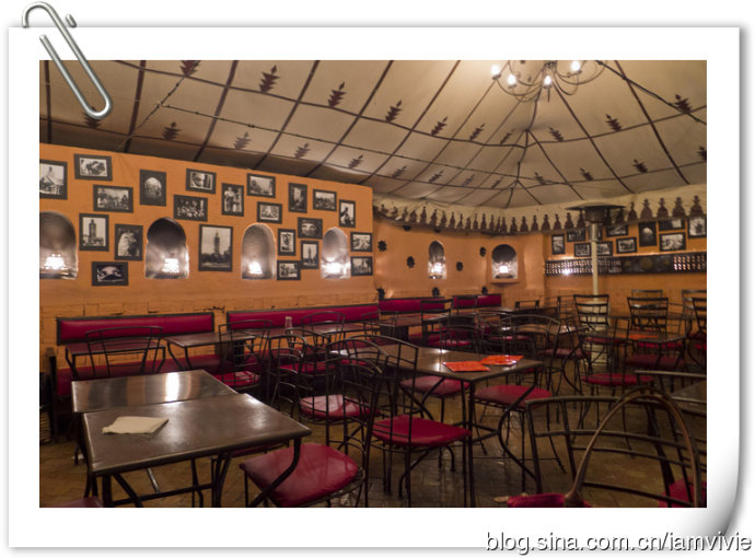 我和Lin广场边上找了家餐厅吃晚饭,这家餐厅绝对都是做游客生意的,环境好而且卫生间也超级干净的,这在摩洛哥非常不容易唉。摩洛哥入如果吃路边摊或者小店,是非常便宜的,像这种比较贵一点的饭店,其实价钱也是可以接受的。我点了鸡肉Tajine,Lin因为拉肚子不敢再吃摩洛哥食物了,点了披萨。