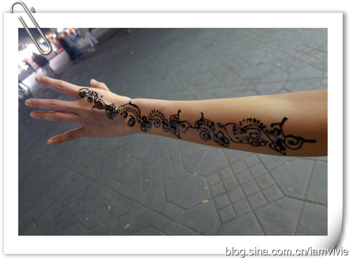 我和Lin都是很想尝试henna的,就是用草本提炼出来的染料,画在皮肤上大概能持续两个到三个星期。据说广场上会有人拉着你的手强迫给你画,要小心。可是我们很想被画唉,怎么都没有人来拉我们的手!只好结账时问服务员,哪里有画,服务员指下面的广场就有,我们就去寻觅了一下,果然找到了。和那姑娘讲价一番,我和Lin都画了,不过姑娘也是转过脸来就要不承认当时的价钱,我懒的烦,给了30迪拉姆。Lin咬定当初的价钱不肯多给她钱,姑娘就说那你给我点东西吧,伸出手在嘴巴上比划了一下,大概是问我们有没有唇膏什么的。我记得包里还剩下些巧克力,就给她算了,那姑娘一下子蹦起来,高兴地和什么似的,我和Lin都震惊了。既然姑娘那么开心,我就趁热打铁说,那你再给我画一朵花,姑娘说没问题没问题,我就又在右手上画了个小的。这个大概半个小时就开始结疤,之后就会脱落了,然后就印到了颜色在皮肤上。我后来在chefchaouen画的那个不是这样的,是要用水洗掉的,不过那个没这个持久。