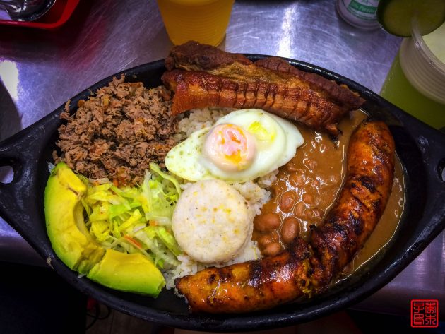 中午吃了著名的当地名菜bandeja paisa,bandeja是西班牙语一盘菜的意思,paisa是地区的名字,其实就是来自于paiso地区的菜。2005年的时候哥伦比亚政府打算把它定为哥伦比亚的国菜,将它改名为bandeja montañera,这样就不会只包括paisa地区了。但这个提议受到反对的理由是,只有很小一部分哥伦比亚人是经常吃这道菜的,而且只起源于一个地区,所以定位国菜并不合理。但提议的备选菜Sancocho不仅仅是在哥伦比亚食用,在许多国家特别是中美和加勒比海国家都是很普及的,所以也不是很合适。通常认为的最具代表性的哥伦比亚菜是ajiaco,我在波哥大有吃,之后再介绍。
