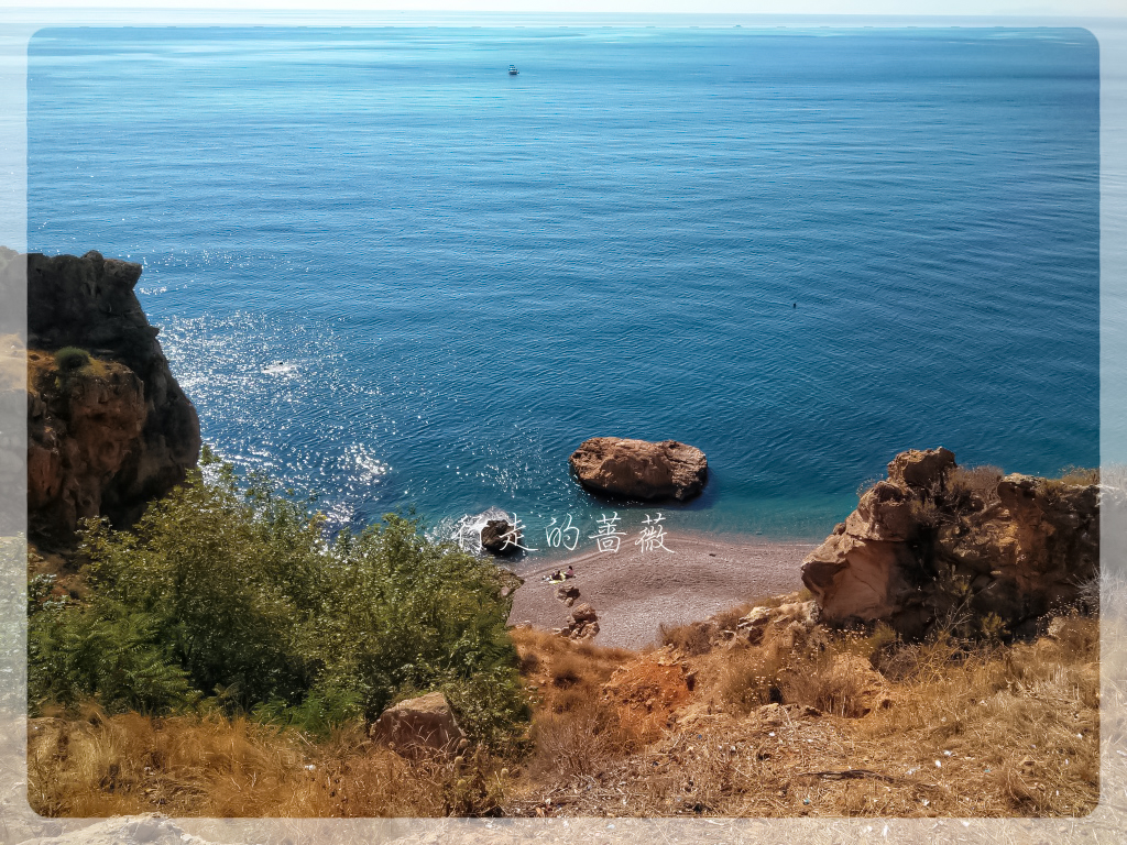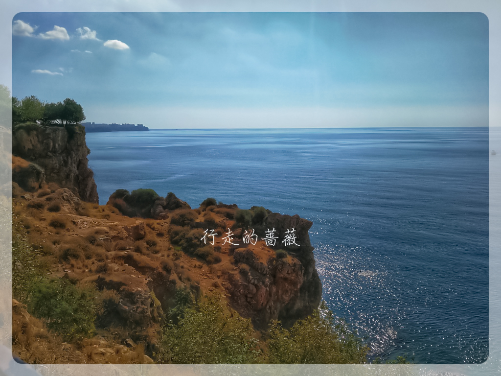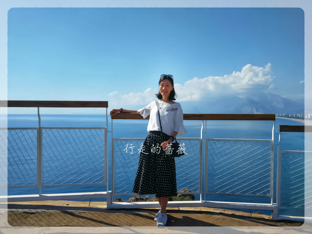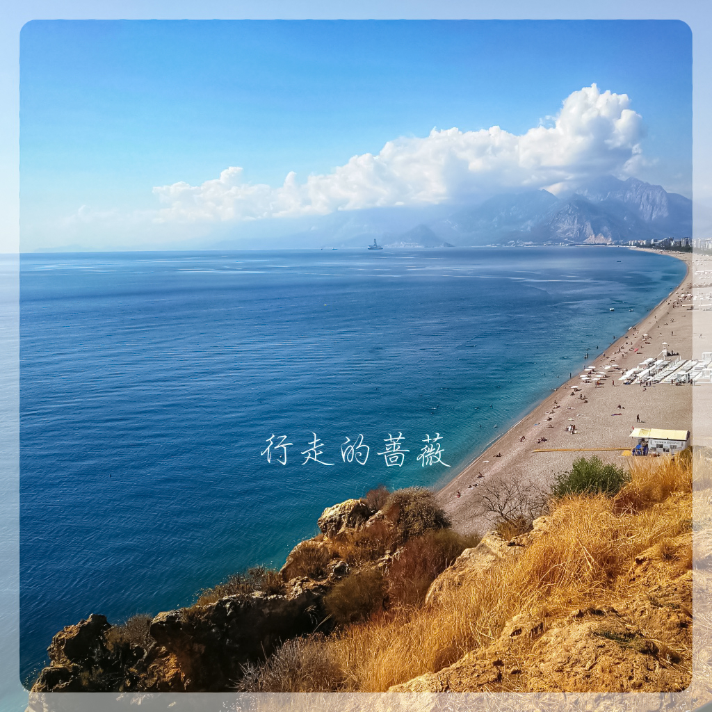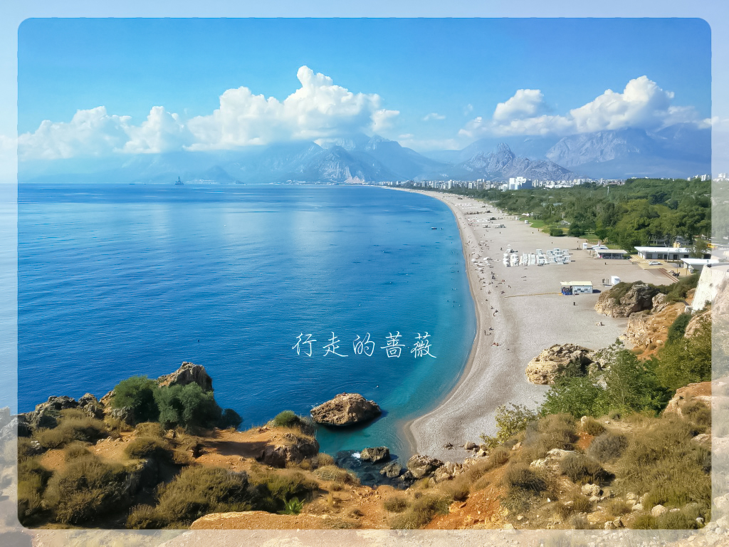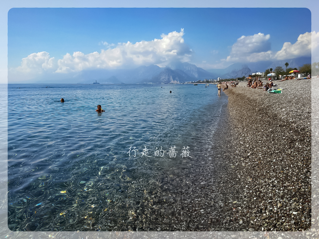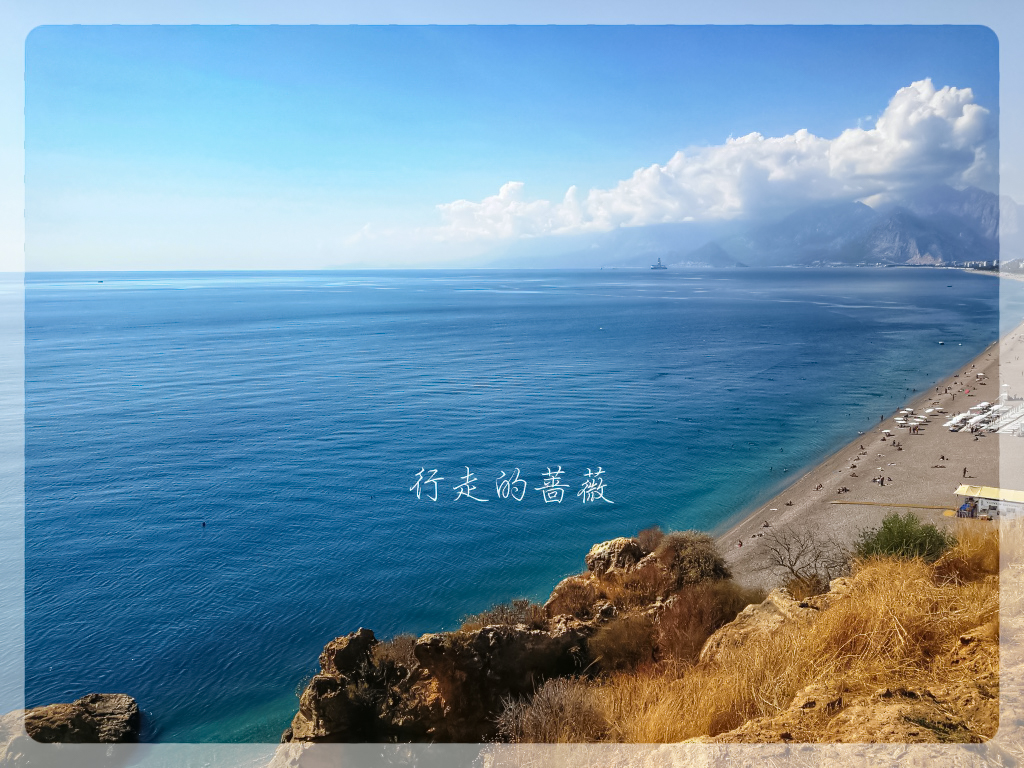 天气真是不错,心旷神怡。今天的目的地是Konyaaltı Beach海滩和旁边的Antalya Museum安塔利亚博物馆,从老城坐有轨电车tram可以直达,十几分钟就到了。一下车在悬崖上俯视海滩,真是好美,因为不仅是海景还有远山。安塔利亚主要有两个海滩,这个是在西面,另外一个Lara Beach在城东面。