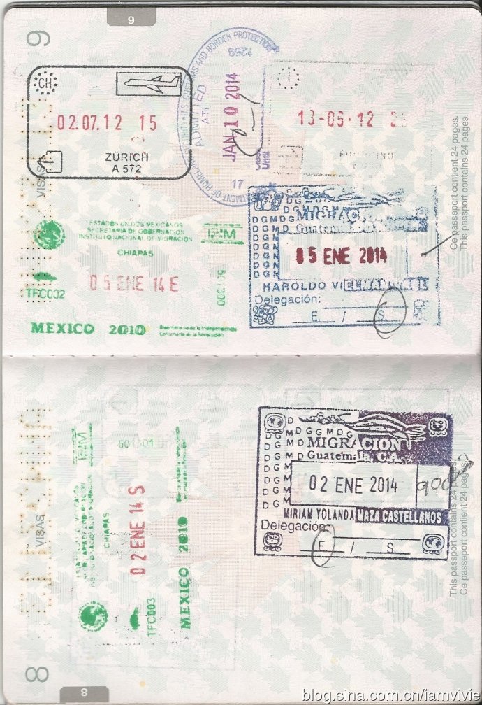 等了两个多小时了吧,司机终于决定开车了!开路!危地马拉的入境处从河边开车还要将近一个小时,在这里办理入境手续盖章,入境费5美元,工作人员拿我护照看了下,突然喊了我的名字,吓我一跳还以为怎么了呢,结果只是喊喊而已。。。我觉得危地马拉的入境章离境章还挺美的,非常的玛雅风!图上右边那两个是危地马拉的,下面的是入境,上面的出境,写的数字什么的看不太清楚,好像是90天的意思吗?可我记得危地马拉是只能待30天嘛,难道我记错了?左边那两个绿油油的是墨西哥的,美国加拿大都没有离境章,一直觉得这些盖离境章的国家真是浪费护照页,像墨西哥危地马拉那样的章还那么大个!但是美国海关我很爱,虽然入境章很土,完全没风格,但是工作人员每次都找空隙里面盖,不占地方呢,最上面中间的就是美国的入境章,硬是挤着盖在意大利入境章和瑞士离境章的中间了,好贴心呀,啦啦啦。
