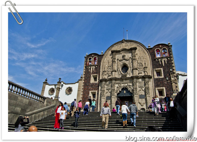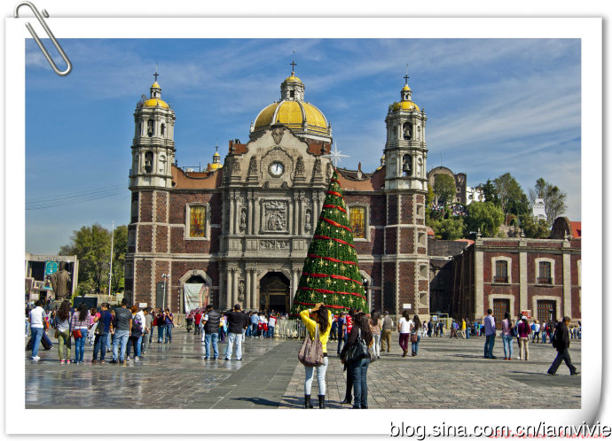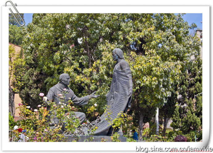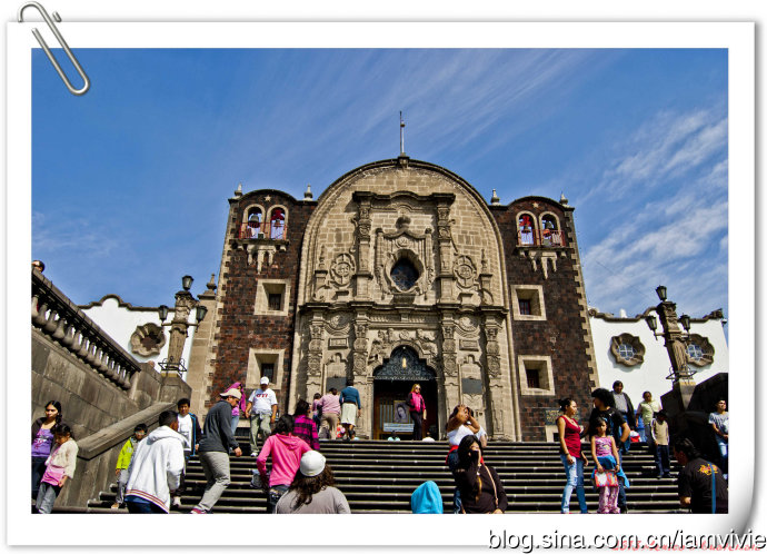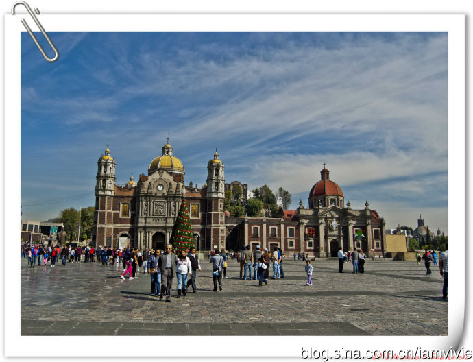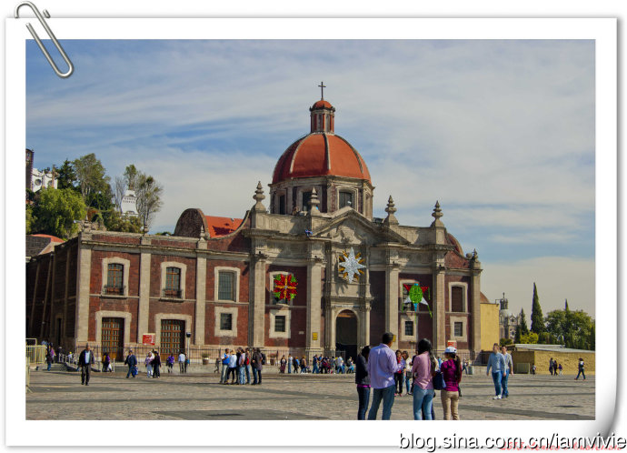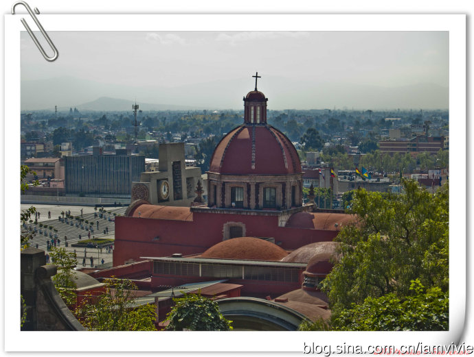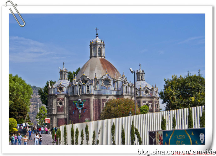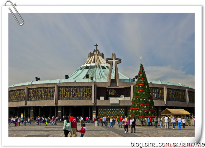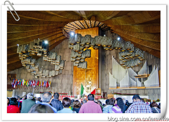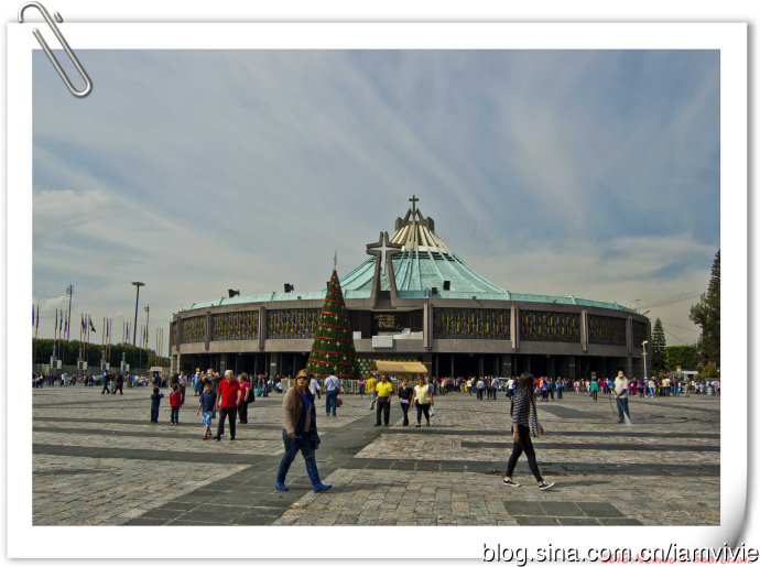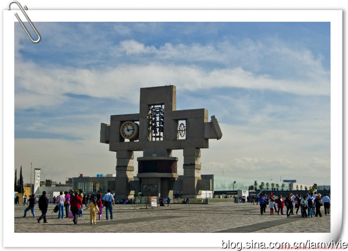 这个绿色顶的是新的瓜达卢佩教堂,那造型和体育场一样,太现代了很难和教堂联想在一起。因为旧教堂不断下陷的危险,在1974年到1976建了这座新的,据说能容纳高达五万人!我说就是体育场吧!我们一进去就被那阵势吓坏了,很多人在集会,绝对的里三层外三层,中间坐着几个人透过话筒在宣讲,大概是传教吧。但是听上去的语音语调,实在有点煽风点火做坏事的嫌疑。。。