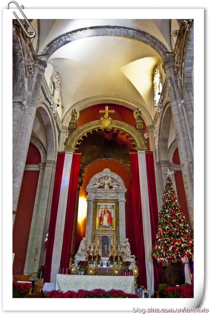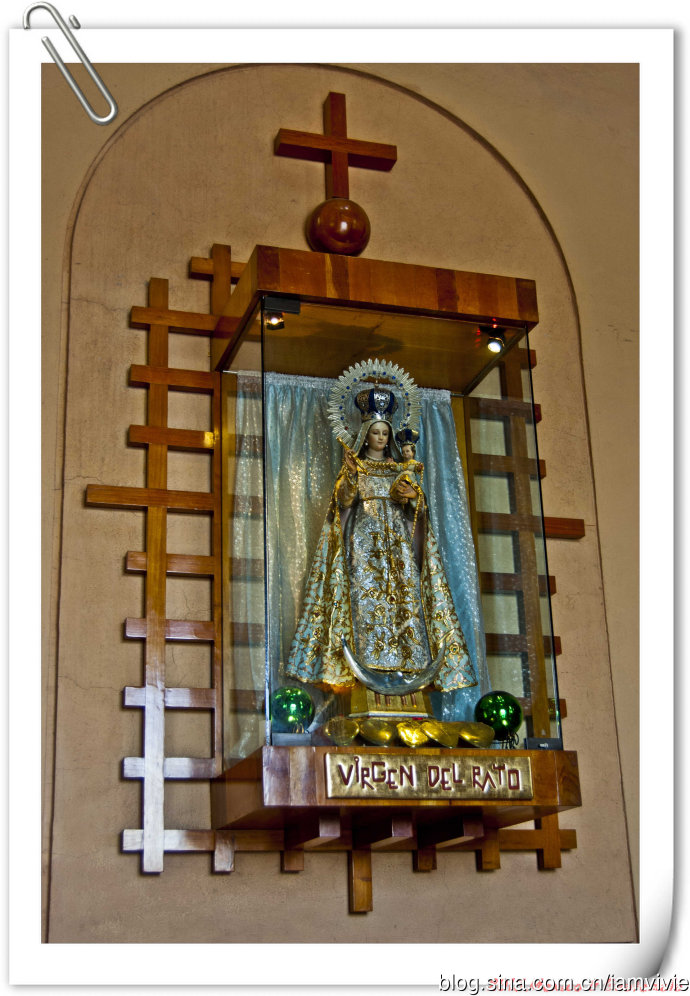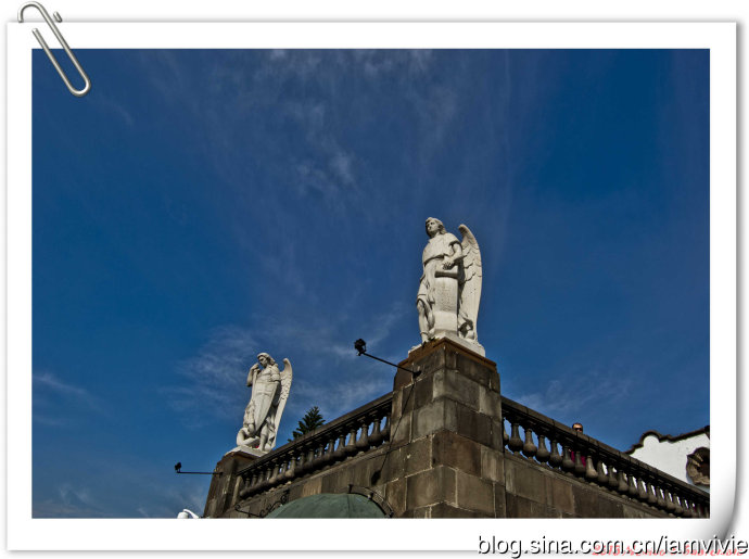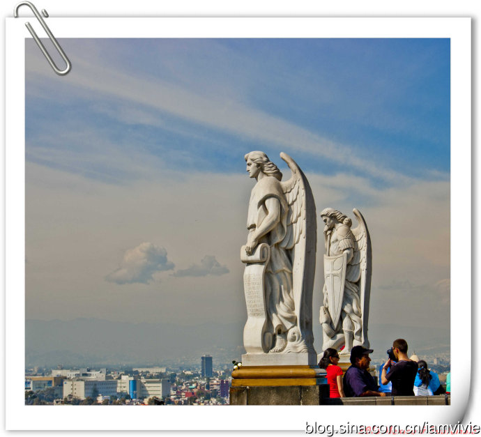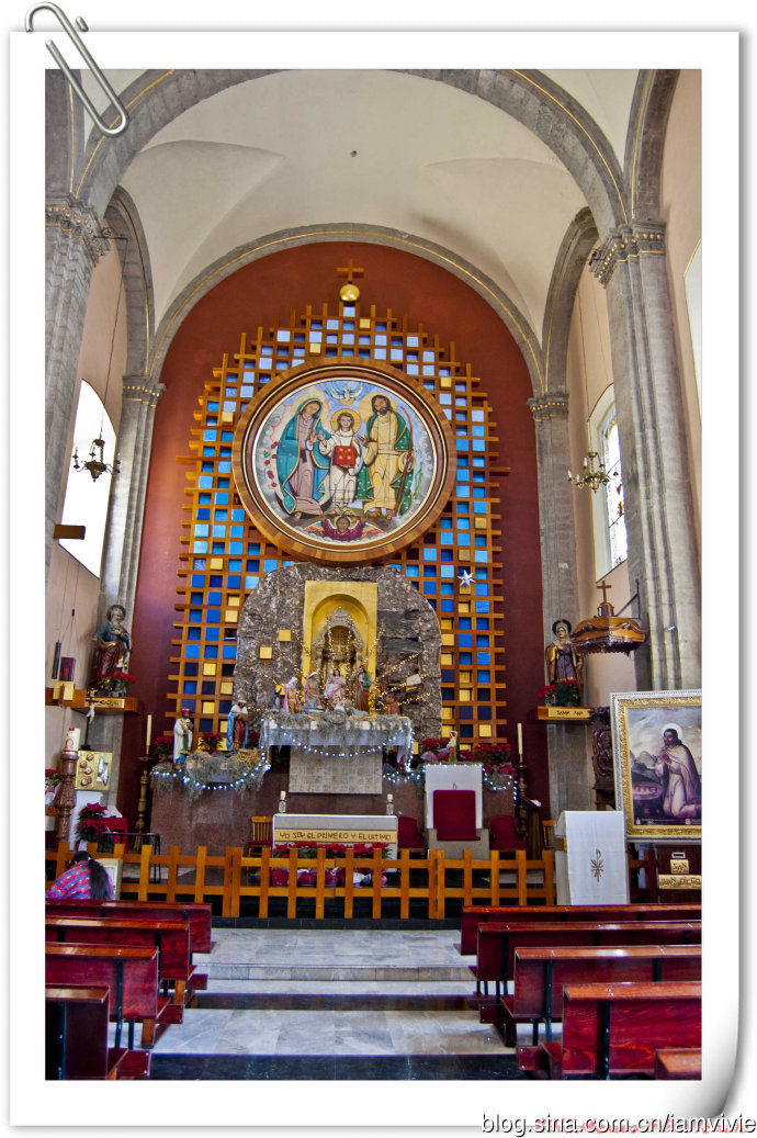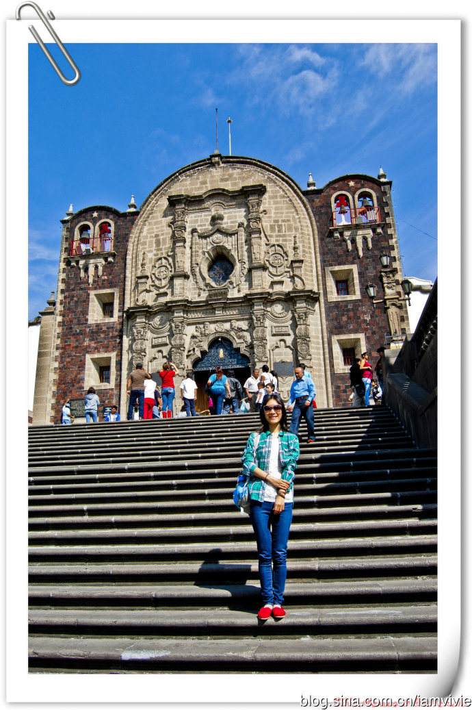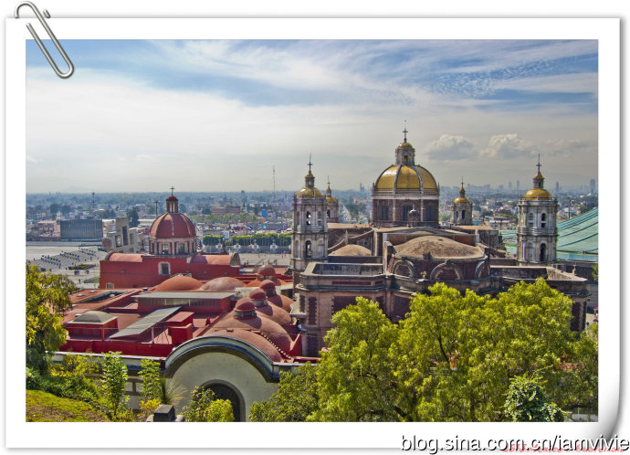 这个绿色顶的是新的瓜达卢佩教堂,那造型和体育场一样,太现代了很难和教堂联想在一起。因为旧教堂不断下陷的危险,在1974年到1976建了这座新的,据说能容纳高达五万人!我说就是体育场吧!我们一进去就被那阵势吓坏了,很多人在集会,绝对的里三层外三层,中间坐着几个人透过话筒在宣讲,大概是传教吧。但是听上去的语音语调,实在有点煽风点火做坏事的嫌疑。。。