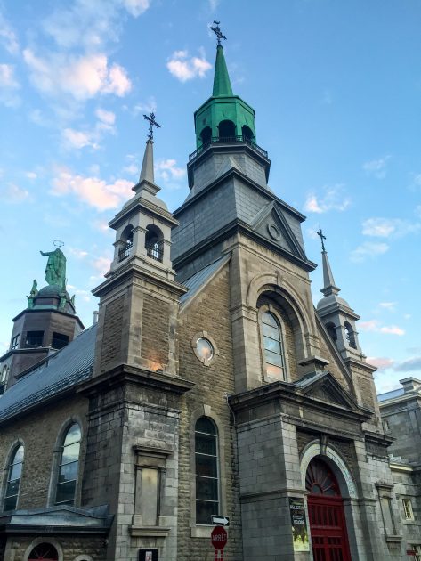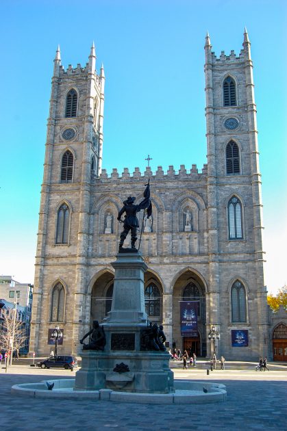 在Place-d’Armes广场对面的 一座维多利亚哥特式罗马天主教堂,外形和巴黎圣母院的双塔相似。在1843年竣工的时候曾经是北美最大的教堂,也保持了超过五十年的第一头衔。曾在1994年举办过国际巨星魁北克歌手Celion Dion的婚礼,2000年举行了来自于蒙特利尔的前总理Pierre Trudeau就是现任加拿大总理小土豆的爸爸的国葬,为了纪念老土豆蒙特利尔的机场也是以他命名的。