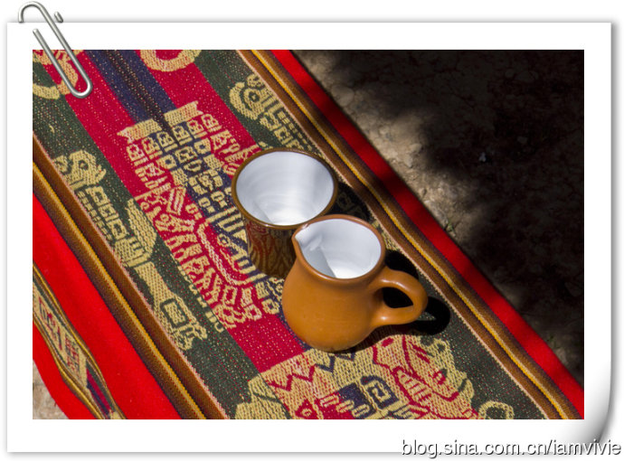 喝薄荷茶的杯子还挺别致的。那底下的布,算是非常有秘鲁特色的图案,后来在别的地方买了两块带回来。打算一条当桌布,一条铺沙发上,哈哈哈。很便宜,要不是体积太大,买个十条八条的带回来,超级民族风。