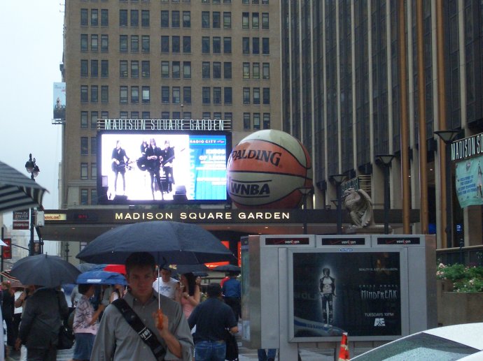 虽然我们已经充分地做好了心理准备,纽约的地铁非常的复杂,我还特意买了一本地铁地图的书带去。可是进了地铁站还是有点不知所措,还好我们只坐一站,稀里糊涂的也正确的到达了目的地。出了地铁站,我一眼就看到了我心目中的曼迪逊广场花园,纽约尼克斯的主场。虽然球队现在没有显赫的战绩,可是依然是贵族球队,很多名人都来这儿看球。我买的介绍纽约的书上写道,来曼迪逊广场花园看球,this may be one of the more difficult things to do in New York。不过实在是很失望,根本不像电视上看到的那样光辉灿烂,灰土土的圆形建筑,挨着纽约火车站penn station,连场外那个电子屏幕都残缺不全–有些灯甚至都不亮了,确实挺让我沮丧的。不过想想1968年建的,也算还不错了。照片如下,现在外面挂着变形金刚的大幅宣传画。
