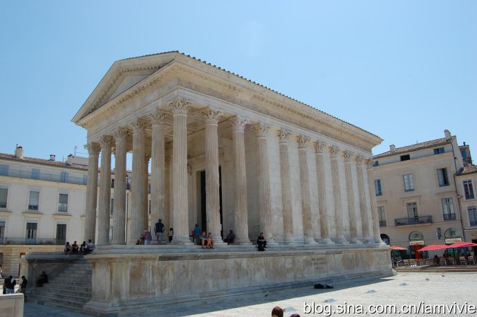 从角斗场出来,我们去往下一个景点古罗马神庙,这几个景点都不太远,但是那一天特别热,应该是我们到法国最热的一天,绝对的烈日炎炎,走在路上什么都不干都直冒汗。可是我们想买杯冰咖啡都没有机会,街边的咖啡店都不卖携带咖啡的,我们也没有时间坐下来,就算了。这个古罗马神殿,据说是至今所有古罗马遗址中保存最完整的神殿之一。我们看了觉得确实很完整,我们一度以为是后来仿造的,因为看起来没有那么大年纪,没太有岁月的痕迹,没想到竟然是个真的!内部现在没有什么了,只是一个放映厅放映有关尼姆英雄的3D电影,让游客了解尼姆的历史。