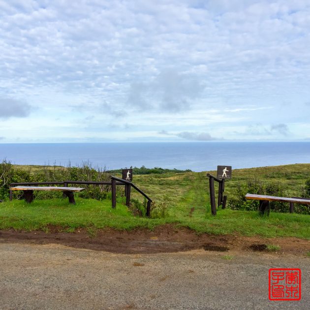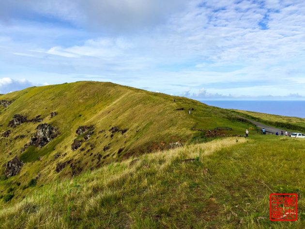 下午先到了Puna Pau,火山口有着独特的红色的石头,这个地方是用来制作Moai石像的帽子Pukao。可爱的国家公园标志。
