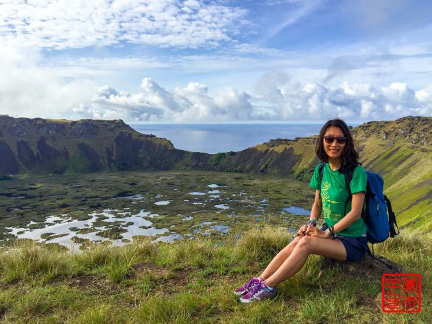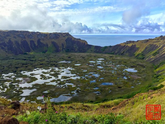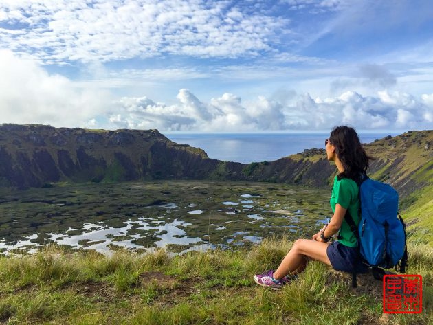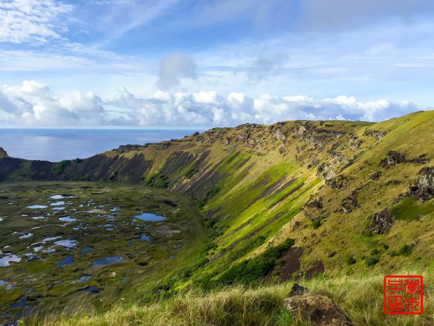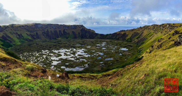 第一个景点是位于Orongo村庄的Rano Kau火山积满了水的火山口,离我们居住的村庄Hanga Roa比较近。复活节岛Rano Raraku和Orongo两个地方是需要检查国家公园门票的,门票挺贵的,80美刀或54,000智利比索,在机场就能买到。2017年智利前总统把复活节岛原始土地以国家公园的形式归还给原住民,历史上第一次,国家公园产生的收入投资于该岛,用于保护自然遗产。这确实是个好消息。