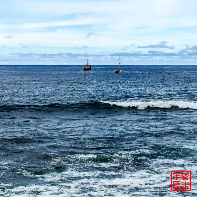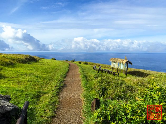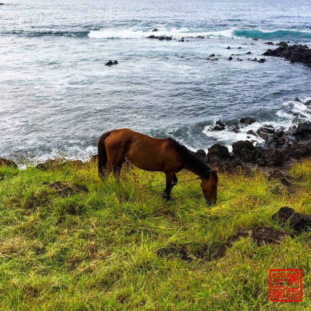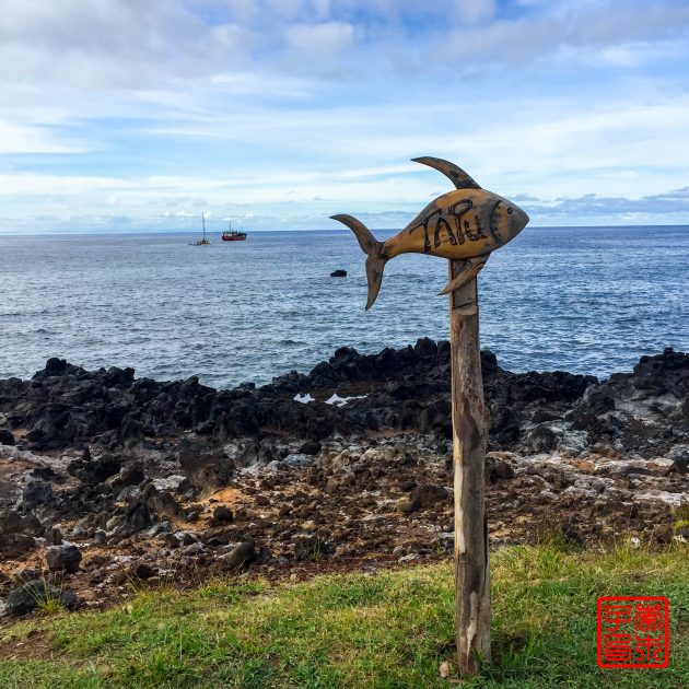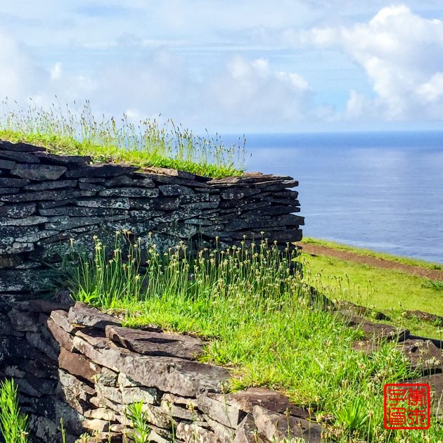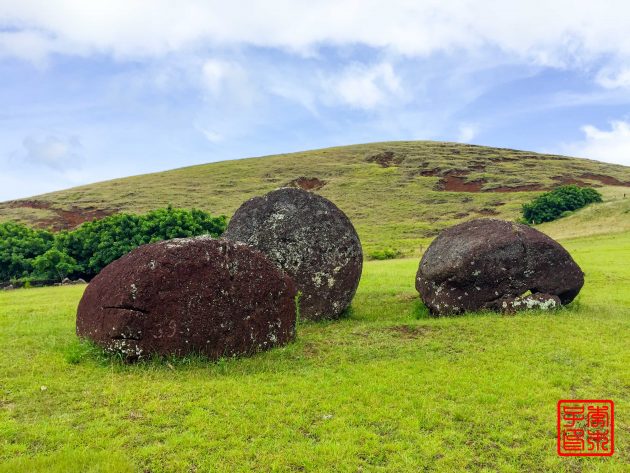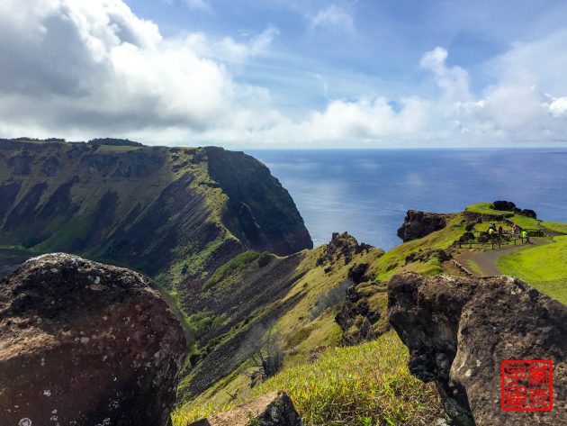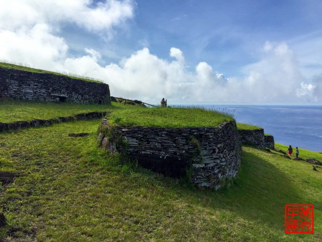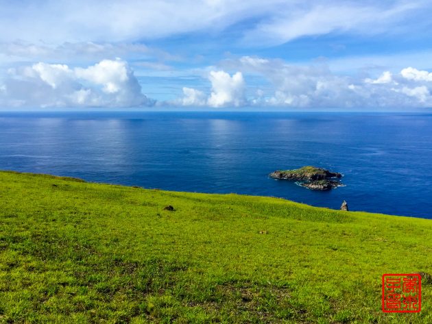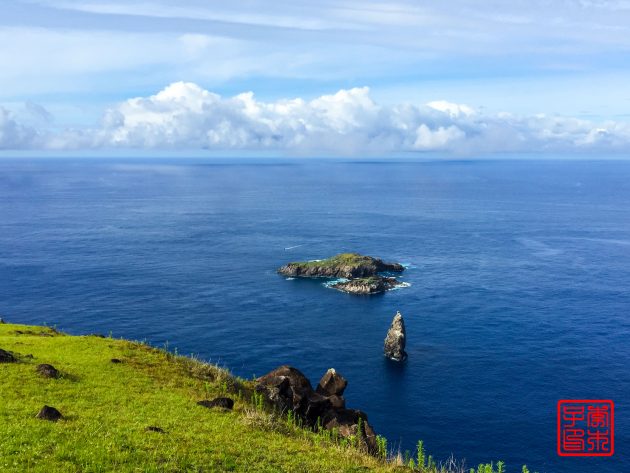 下面三个小岛从远到近分别是Motu Nui、 Motu Iti和Motu Kau Kau,这里是原住民每年进行鸟人竞赛的地方,传说岛上信仰的是鸟人崇拜,大概是因为在这个与世隔绝的小岛向往鸟一样可以飞向远方。鸟人Tangata Manu(tangata “human beings” + manu “bird”),每年在海鸟繁殖期,在小岛上拿到当年第一个鸟蛋并游回复活节岛爬上悬崖的勇士被当做神圣的鸟人,享有特权和供奉。之后1860s基督教传教士来到岛上,鸟人崇拜才被压制。