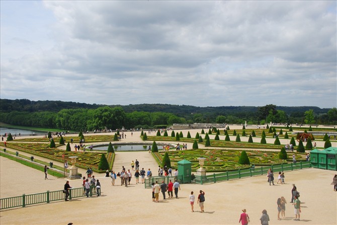 凡尔赛宫主要的建筑是一进门的宫殿,有半边宫殿外部在整修,都没法照到好的全景照片。参观凡尔赛的人很多,取了语音导航就顺着人流走,一个屋子一个屋子参观就行了。每个屋子听听语音介绍,再加上人太多也没法走快,这样把宫殿参观完也花掉不少时间。我的感触是,确实够奢华!出了宫殿,就进入花园了,花园很大,难怪别人说要租一辆自行车在里面逛逛也要一天。皇家园林也很漂亮,只是我们的脚力明显不够,在浩大的凡尔赛花园里,我们显得是那么渺小。。。我们在花园休息了一会儿就向着另一个景点–大小特里亚侬宫进发,悲催的这两个宫殿在花园的另一端,我们只好晃晃悠悠的游荡过去。大特里亚侬宫是整个凡尔赛宫中的所有建筑中最高雅精致的,还有小花园什么的都显得很有情趣,路易十四安排了些皇家亲戚住里面,也时不时的在里面举办宴会。小特里亚侬宫,路易十五的什么夫人曾在里面住过,也是路易十六的皇后玛丽-安特瓦内特最倾心的住所。玛丽-安特瓦内特是法国历史上臭名昭著的奢侈皇后,看到小特里亚侬宫里面不同色系风格的家具,真是漂亮极了。记得获奥斯卡最佳服装奖的那部玛丽-安特瓦内特电影,里面的衣服也是华丽的不行。法国的宫廷还真是奢华的代名词,难怪现在盛产奢侈品牌。