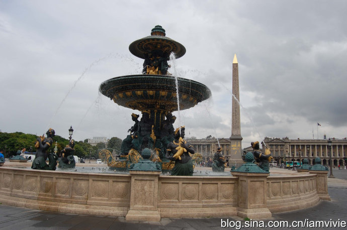 广场周围由雕塑和喷泉环绕,另有8座雕像,代表法国8座主要城市。广场的中央是方尖碑,它是十九世纪埃及政府送给法国的两个方尖碑之一。wikipedia上是这样说的:另一个仍留在埃及因为以当时的技术来说这太困难且太重以致于不能运到法国。1990年代,法国总统把第二个方尖碑归还给埃及政府。我怎么没看明白呢,是说本来要送后来送不过去,结果法国就不要了回赠回去了?其实赠过来赠回去都没移动过?!细细说去埃及的时候,埃及人说是法国人抢他们的,难道是法国逼着人家送的?还有我们看到的巴黎的自由女神像也是,法国人先送了美国一个就是纽约的那个,之后美国人又回赠法国了一个自由女神,赠来赠去有意思没意思呀!