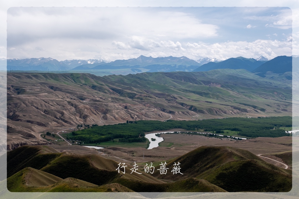 路边有一个观景台,下面的景色有点失望,光秃秃的,好像是叫阔克苏大峡谷。这边其实真的很神奇,有的位置就是绿油油一片,有的就是灰突突感觉长不出草,差别很大。下面河边的绿洲应该是克孜勒阔拉村。