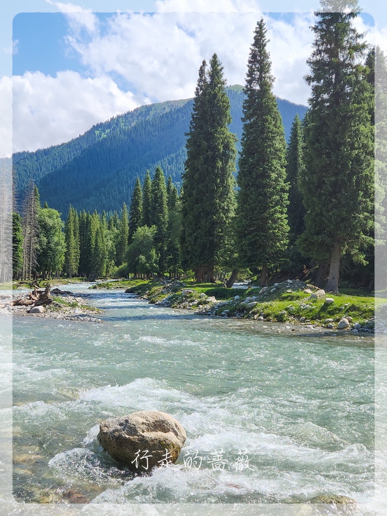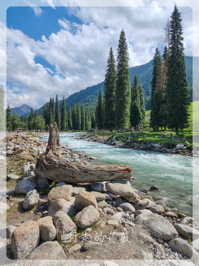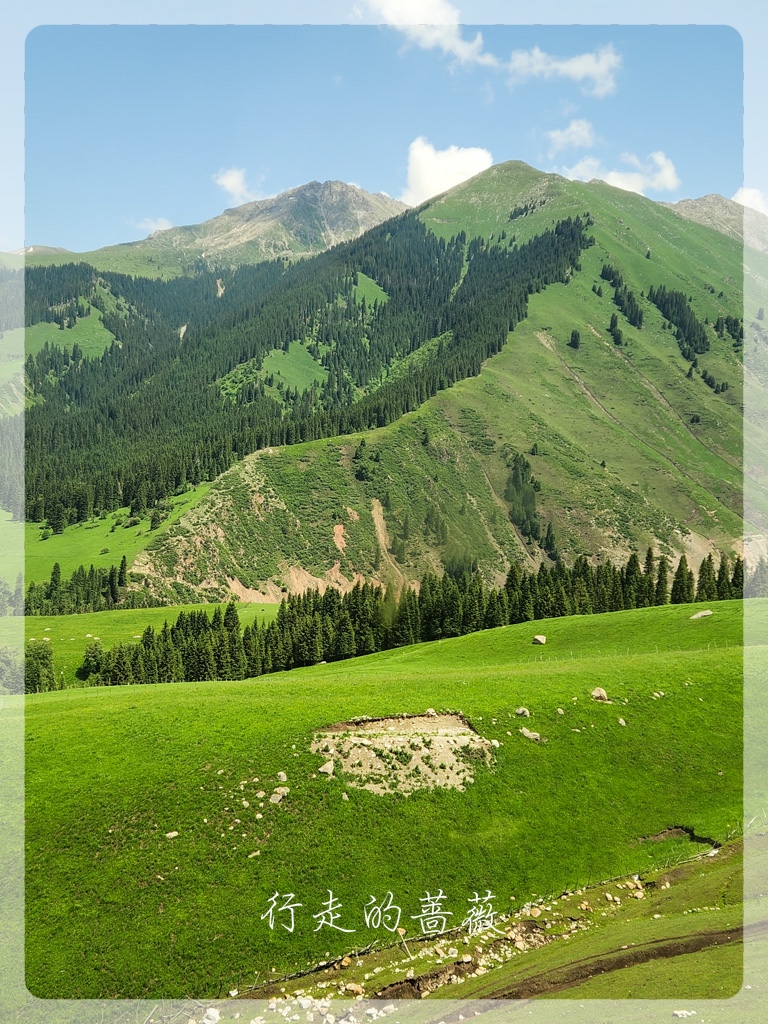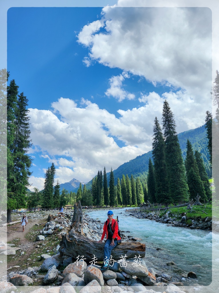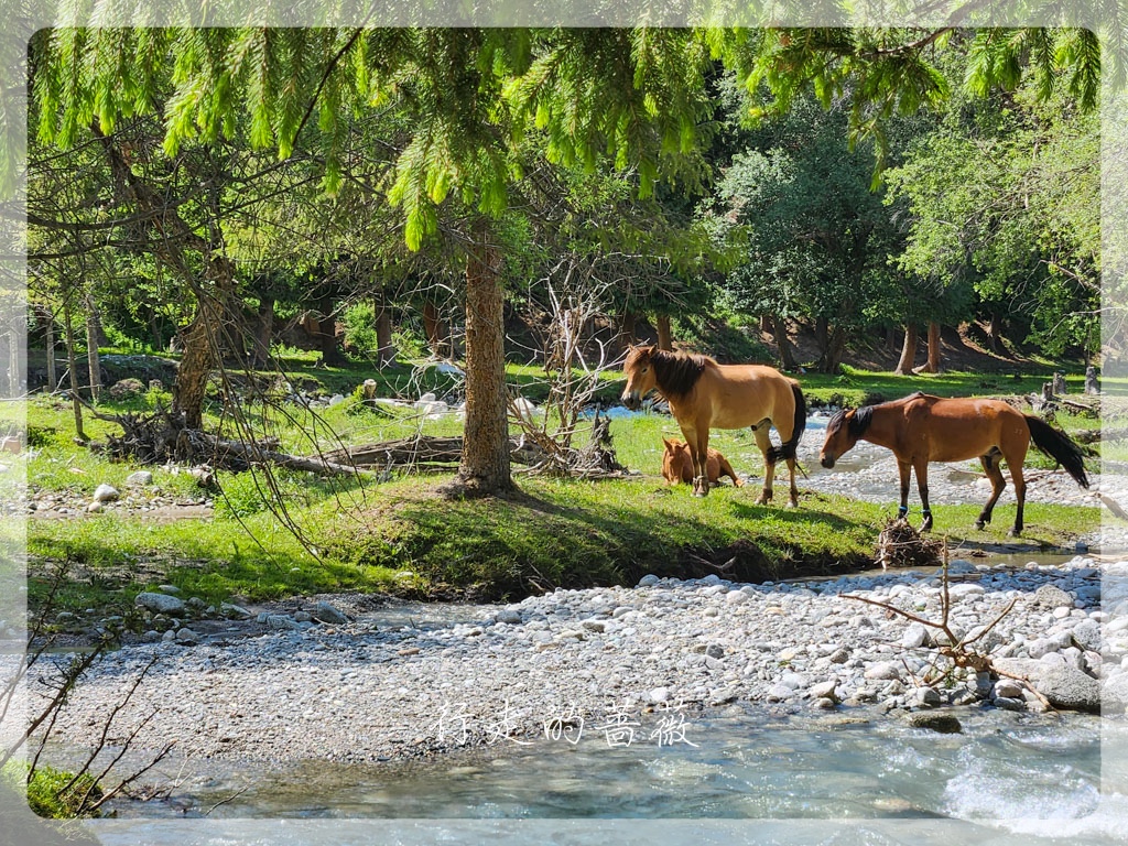 琼库什台是国家历史文化民村,这里不仅是喀拉峻徒步起点,同时也是著名的乌孙古道的起点。大家其实都是超级想去走乌孙古道的,但是我实在是不想天天趟水过河,来新疆前,挑来挑去不用淌水的长线就只剩下喀拉峻大环线了。所以,虽然没办法去,还是想来朝圣一下的,前阵子Lily好像刚来过这里,还在乌孙古道的石头前照了相。可惜,我们来之前,乌孙古道因为暴雨,所以现在封路,不让徒步者进入。果不其然,通往大石头的路前面有一个人,把试图进入的人都拦住不让进。我只是想和石头拍张照呀,也是没办法,看到一些背着大包一看就是准备徒步乌孙古道的人,也被劝退,真是有够惨,毕竟来之前谁都不知道不能进了呢。