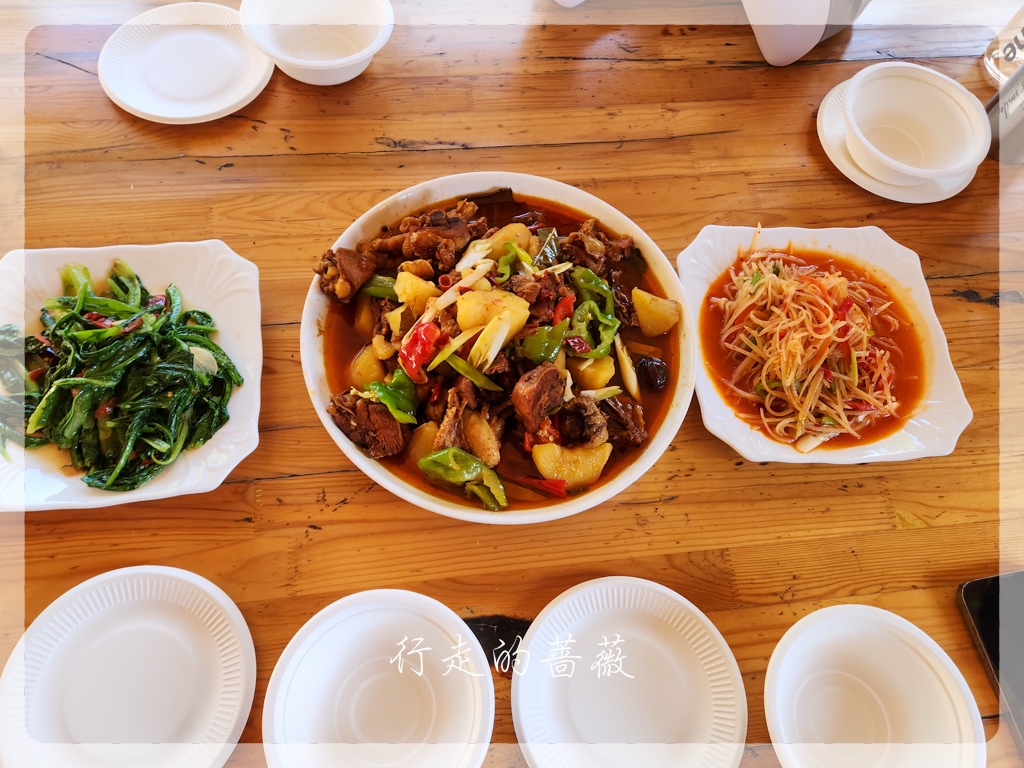 还有人问买什么手套的,我就不太理解,对我来讲如果不是寒冷或者要攀爬石头,为什么要带手套呢。有人说是登山杖会磨手,那得使多大劲儿啊,我是从来没有被磨到,大概我的手就是个摆设吧,主要还是靠强壮的腿部肌肉:)戴手套防晒我倒是理解,因为每次我基本只靠防晒霜防晒,所以脸都没什么太大问题,但是手都黢黑,因为一洗手防晒霜就没了。团里安排在附近把午饭也解决了,就离开了县城。