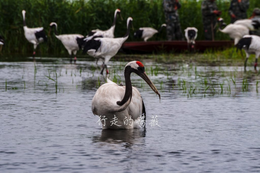 每天放飞丹顶鹤有三四场,我们等的是十二点半那一场,提前来到湖边,已经看到坐满了人。到点以后,饲养员会从山坡后面把丹顶鹤放飞,然后他们会到湖里觅食,就能比较近距离的观察丹顶鹤了。大概半个小时左右,吃饱喝足以后,他们就会飞回去了。