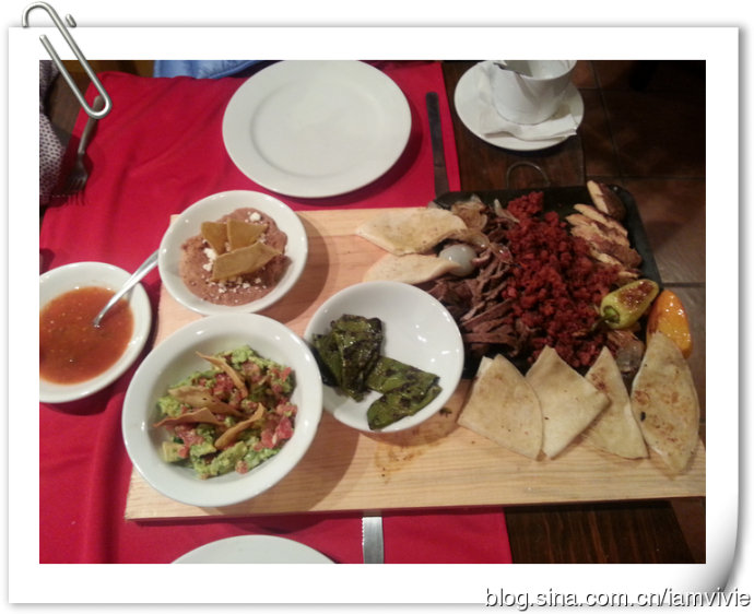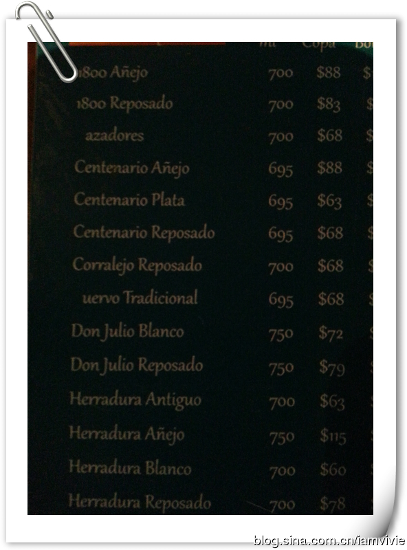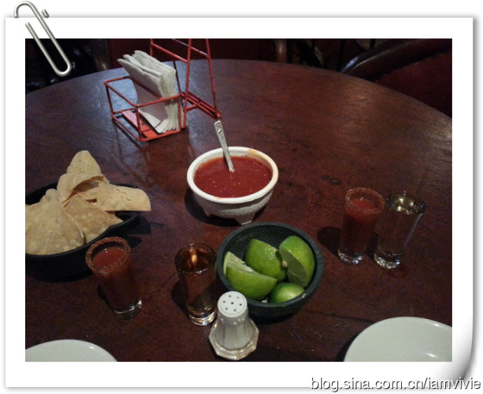 街角找了一家餐馆坐下来吃晚饭,服务员说没饭吃只有东西喝。。。莫名其妙,晚饭时间没饭吃,还以为自己是酒吧呢,哼。不过还好午饭吃的晚,吃点nachos也就凑合了。在车站碰上的华为小弟又在这家餐厅碰见了,坐一起喝点小酒。其中某小弟愤愤的向我们抱怨,说被谢谢和菜菜的照片糊弄了,觉得来了看到景色很失望。我们还没去山顶所以不知道长什么样子,看了他手机拍的照片觉得也不差嘛,他就一直嘀咕自己的不满意,说还出国前特意买了那本新出的瓜纳华佗封面的他们的新书呢,哈哈,我们又很好奇到底有多失望。来墨西哥怎么能不喝Tequila,看看菜单,好多品种呀,完全不了解。。。查了下字典菜单上形容词都是什么陈年啦年代久远啦之类的,就和细细随便一人点了一杯。他们当地喝法是混着番茄汁一起喝的,结果我喝了完全无感呢,细细觉得喝起来很痛苦,我就把细细那杯也喝了,还是觉得和没喝一样。华为小弟一边说我不喝酒,一边很熟练的和服务员点了一瓶葡萄酒和我们四人一起分享。反正那天晚上我是喝什么都无感。。。