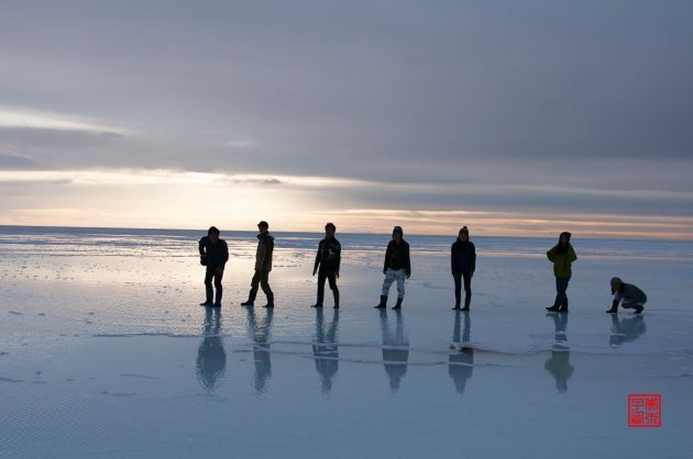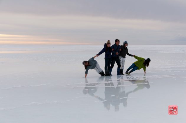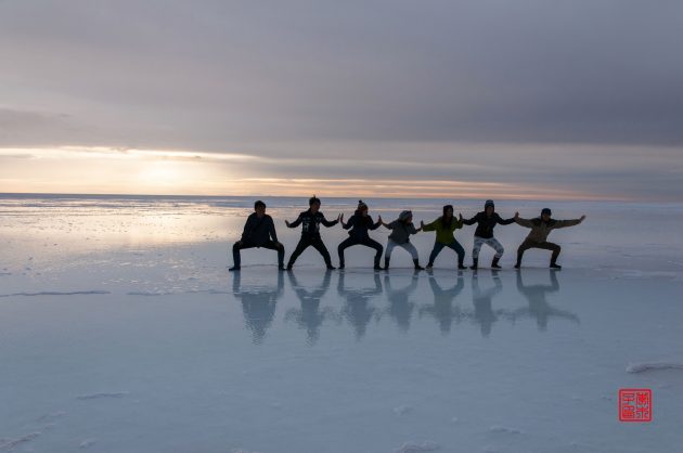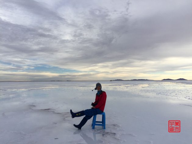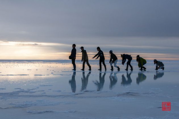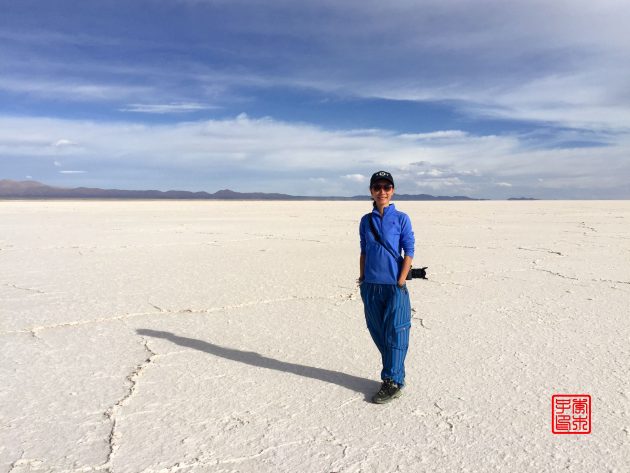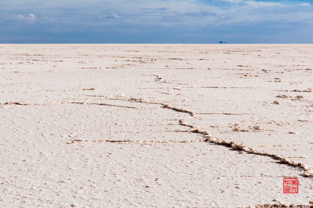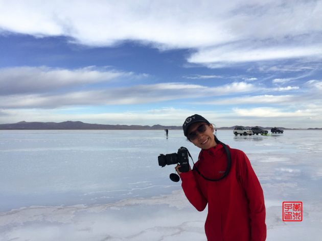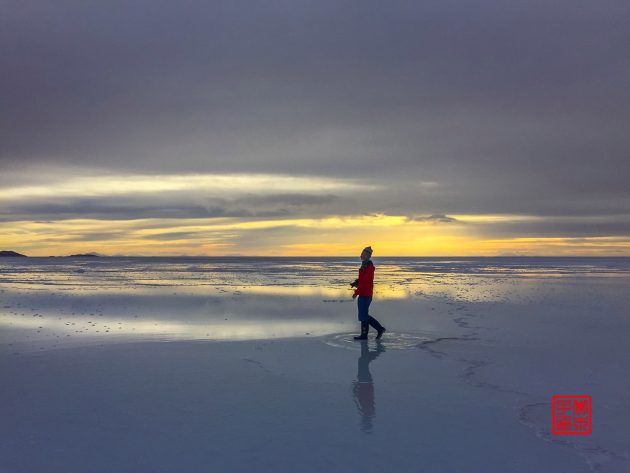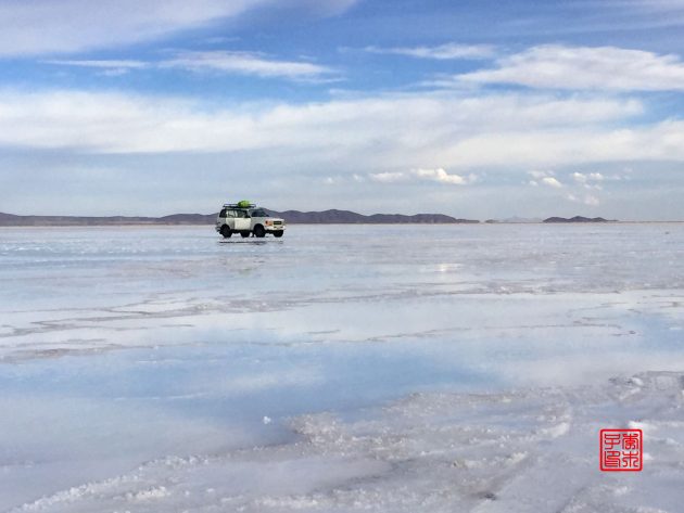 通常每年夏天12月到1月是雨季,湖面会像镜子一样,能拍出美轮美奂的仙境照片,所以大家都叫它天空之镜。我们来的时间应该是正好有水的时候,但是那一年不知道为什么非常的旱,所以盐湖并没有非常多的水,地上还能看到一块一块的痕迹。司机找了一片有水的把车停下让我们自由活动,后来又来了好几辆车。我们在附近寻寻觅觅一些小水面拍倒影。