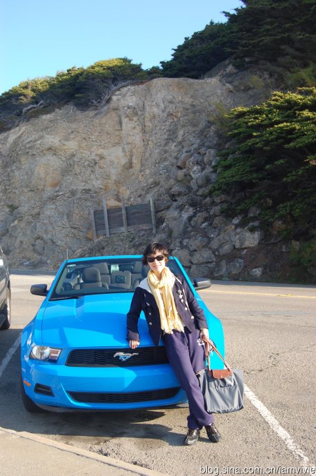 这一天的行程是顺着沿海的一号公路从旧金山一路南下到洛杉矶。先介绍一下我们的座驾,一辆敞篷野马,早就听同事说加州租车便宜,何况我们就只租一天,所以提前就和老罗打好招呼,如果加的钱不多的话,我们就租一辆敞篷。老罗总算办了件好事,自己做主租了这辆车,不过一路都和我唧唧歪歪的说做了一个多么英勇神武的决定,说怎么看怎么都觉得他选的蓝色好看,红色的不好看什么的。矮油,这话和我说有什么用,我可是大红色的忠实拥护者!