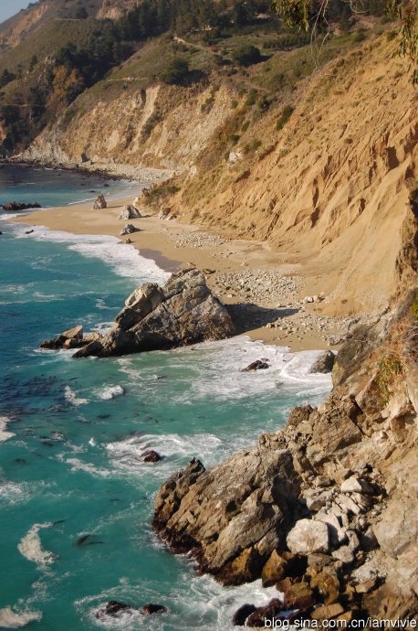 这个地方还是要提一下的,这个是到了big sur附近,貌似我听说过这个名字,所以特别留意要停下来看看。可是因为不知道到底有什么可看,就进了一个游客中心,问了问,工作人员说有一个瀑布可以看。结果,下图就是那瀑布。。。很壮观吧,那一小水柱真是伤透了我们要看瀑布的心呀。这个叫Pfeiffer Big Sur State Park(更新)。