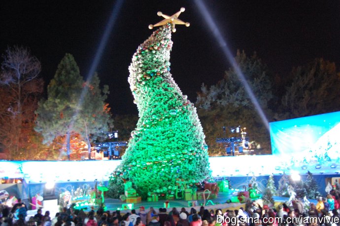 这是环球影城的圣诞树,表演完节目圣诞树会变各种颜色。