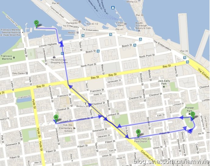 Street往东走,一路上坡到达山顶的Coit Tower也就是地图上的C点。