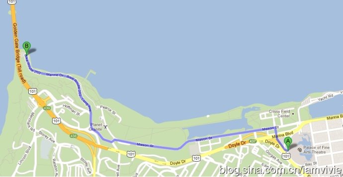 逛完后可以坐车到B点,就是金门大桥的入口。这一段路有点远,其实如果有时间,沿着海边一直走过去感觉是非常好的,走路还是坐车你自己选。金门大桥可以步行的的,可以走一段不用走全了,因为走到头上是没有车回来的,要原路返回。