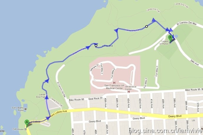 另一个非常建议的地方,是金门大桥的另一端,A点开始的Cliff House,有岩石的海边,我个人超级喜欢。逛完海边那些石头,可以沿着海边的Trail一直往北走,到达B点的Legion of Honor,是一个博物馆,有些罗丹和莫奈的作品,而且是在山顶,可以俯视旧金山,景色不错。