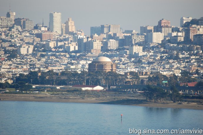 在金门大桥头上,犹豫要不要上桥走走,上网查了一下,金门大桥大概2千米,貌似还不是很远,就想走到头算了。桥上很多走路的和骑自行车的人,旁边的那条道还蛮拥挤的,走在桥上感觉不到什么,可是一拿起相机拍照,就觉得桥晃得厉害,在第一个桥墩换了长焦镜头,拍了一下旧金山远景。还是那两个著名的建筑,圆顶的是艺术宫,尖尖顶的是transamerica pyramid。