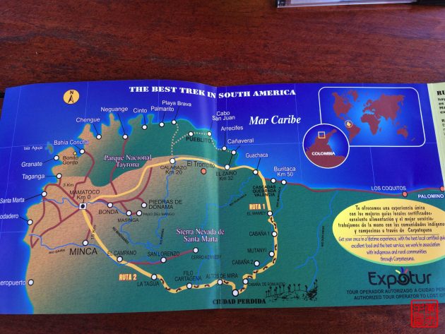 来到了加勒比海城市圣玛尔塔Santa Marta终于有度假的感觉了。打算休整两天,接下来给自己新的挑战五天的Ciudad Perdida失落之城徒步。这条线是在在北部的Sierra Nevada de Santa Marta山脉徒步,那里号称是世界上海拔最高的海岸线。目的地是比马丘比丘还要早650年的遗址,号称失落之城Ciudad Perdida。而且这个遗址除了军队直升机可以直接到达,游客如果不徒步数天是没办法看到的。这里徒步的最大的难点在于天气很热很潮湿,现在是雨季河水会比较高,有点惶恐自己能不能撑得住,从来没在这种气候下徒步过。早上去旅行社Expotur顺利交钱报好名,300美金五天四夜包向导食宿交通。看到了今天出发的人们,貌似很轻松穿的也很随便,稍微有点放心,也许没那么可怕吧。