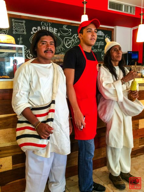 穿这样白色袍子的是当地的原住民Tairona泰罗那,以前是哥伦比亚北部的主要族群。一直觉得美洲Indiginous People这个词儿,纪录片有时候中文会用土著这个翻译,实在是有点蠢,还是台湾经常提的原住民比较切合。看到右面那个人手里拿的东西了吗,叫做poporo,里面装着石灰,它们的文化里混着这个石灰咀嚼可卡叶子能产生新的能量。然后把上面的小棍子拿出来不断摩擦葫芦外壁,好像能越擦越厚。所以看到他们的常态就是嘴里一直嚼着,手里不断搓着,感觉好忙哈哈。