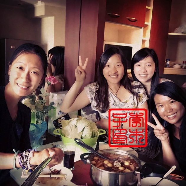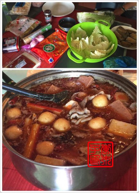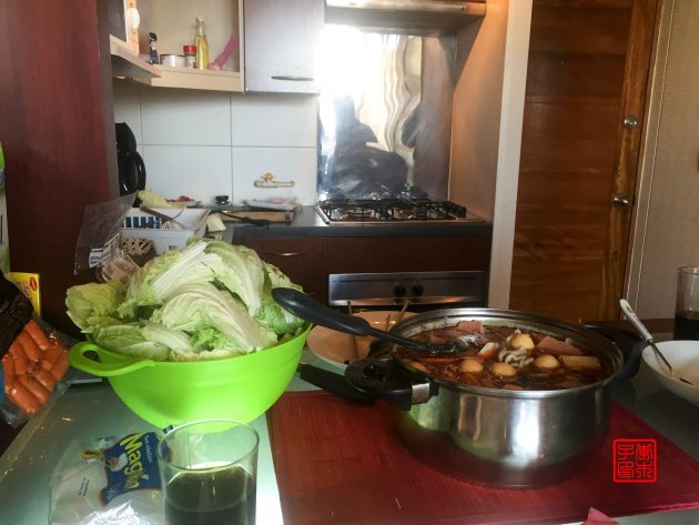 之前在厄瓜多尔遇到来南美旅行的一对台湾女生小胡和小林,她们也恰巧同一时间在圣地亚哥。她们租了公寓住,有厨房,特意相约一起吃火锅,还让细细帮忙从美国带了台湾人最喜欢吃的牛头牌沙茶酱。以前我是基本不怎么喜欢那个口味的,近几年慢慢觉得沙茶酱还不错哦。小何说一定要把大蒜碾碎在沙茶酱中搅拌好,味道最佳,新技能get。我们前一天在韩国餐馆附近的中国超市买了日本小火锅的各种丸子还有些蔬菜和肉带来,配着小肥羊的锅底,简直是美味呀。细细至今耿耿于怀我不让她买绿豆芽,而坚持买了她不吃的黄豆芽,而我早完全不记得这码事了。。。要是现在的我,一定会把绿豆芽和黄豆芽全部买掉!