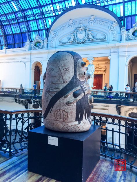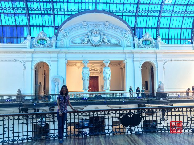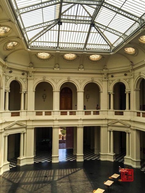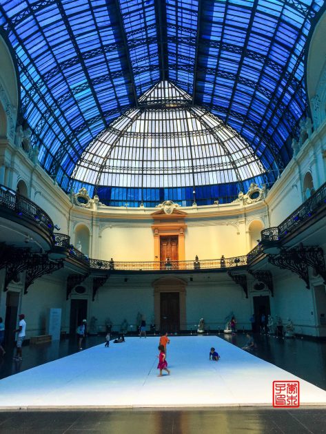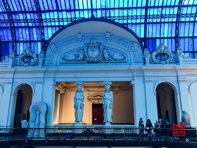 馆藏没有很多,但逛逛还是蛮有意思的。正好碰上舞蹈表演,氛围好好啊。艺术宫Palacio de Bellas Artes是在1910年纪念智利独立100周年建造的,风格是Beaux-Arts。这个Beaux-Arts风,是在巴黎美术学院École des Beaux-Arts所教授的一种混合了很多特点的学术派建筑风格,在法国一直流行到19世纪末,同时很多美国建筑也是这个风格的,因为建筑师曾经也在巴黎这个学校学习过。你看这个是不是很像巴黎的大皇宫还是小皇宫的?建筑本身很漂亮,尤其是蓝色屋顶在里面看很赞。前后两个入口分别是美术馆和现代艺术馆两个博物馆,每个门票才一美刀,有免费的存包柜子。