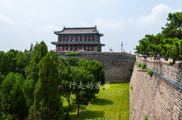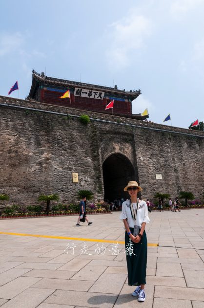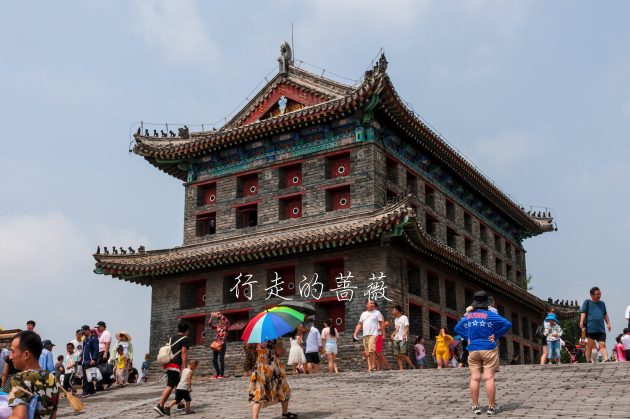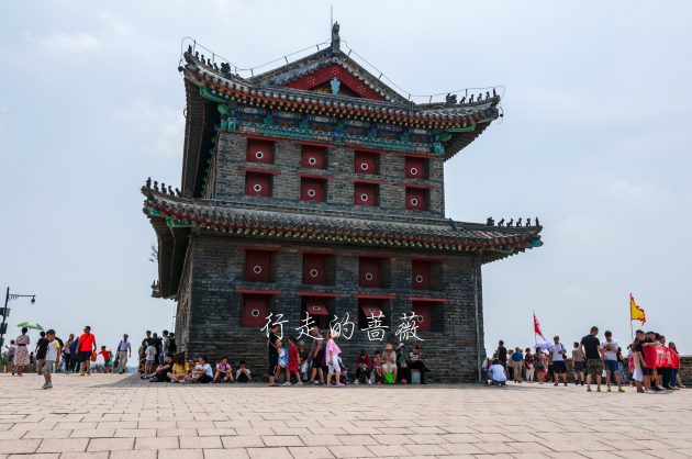 门票用的是刚才在老龙头买的套票,就是为了来到此一游这么个城楼!山海关有四个门,东门就是天下第一关。现在下面还在搭台子,好不容易歪七扭八拍了一张合影留念。爬到上面来,依旧到处是人人人,在城墙上走了走。
