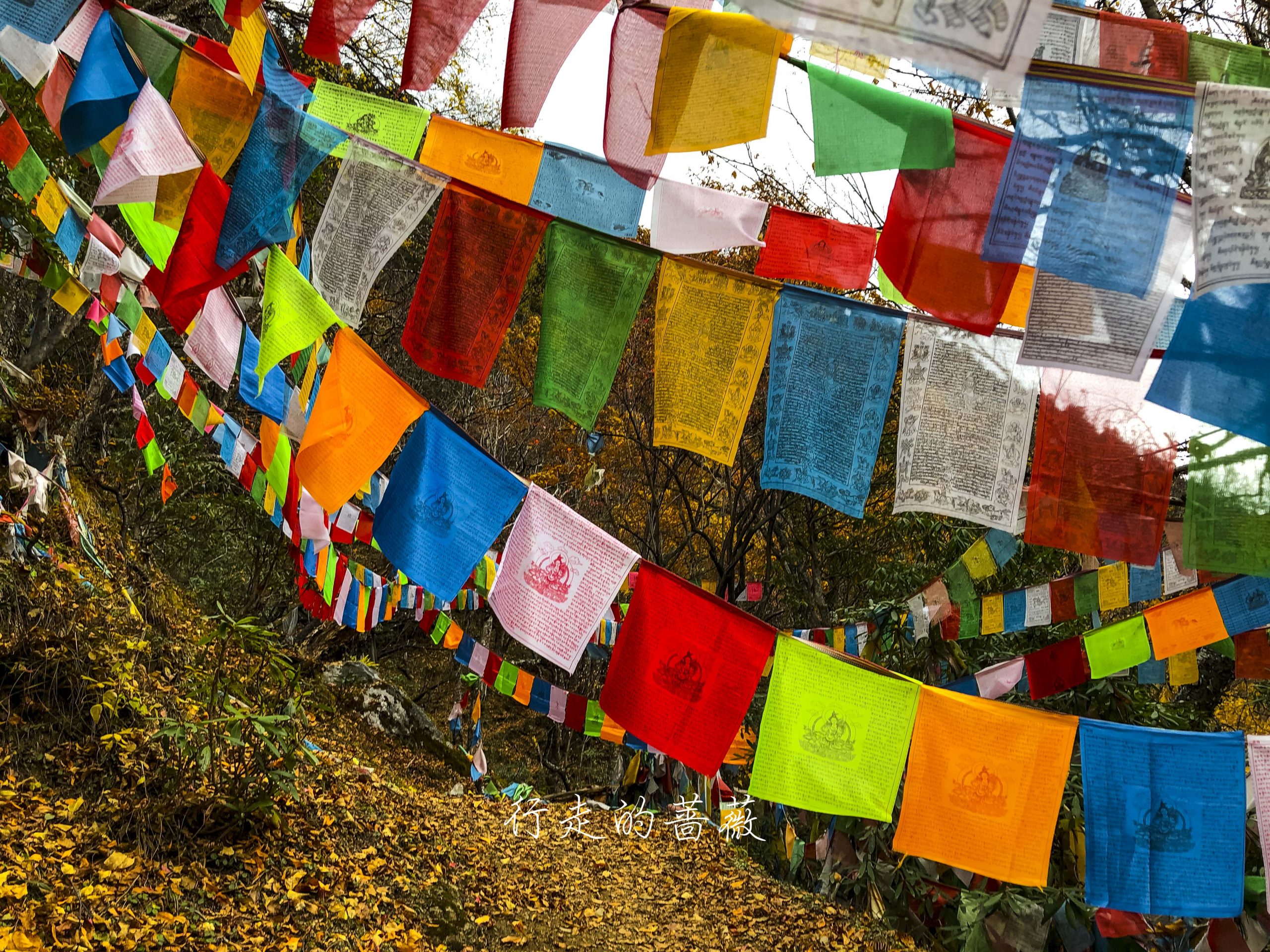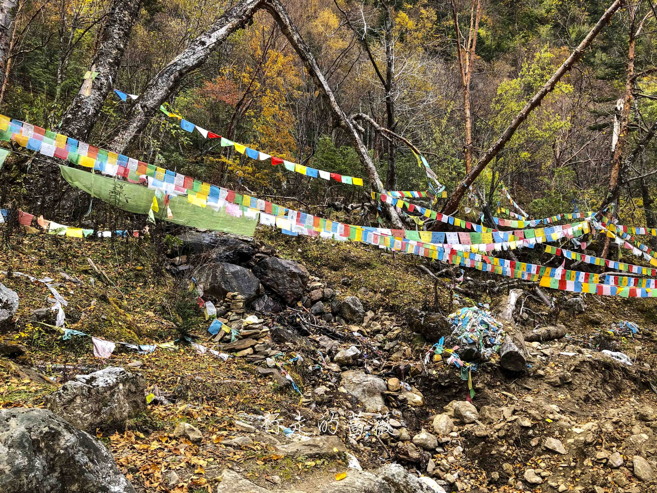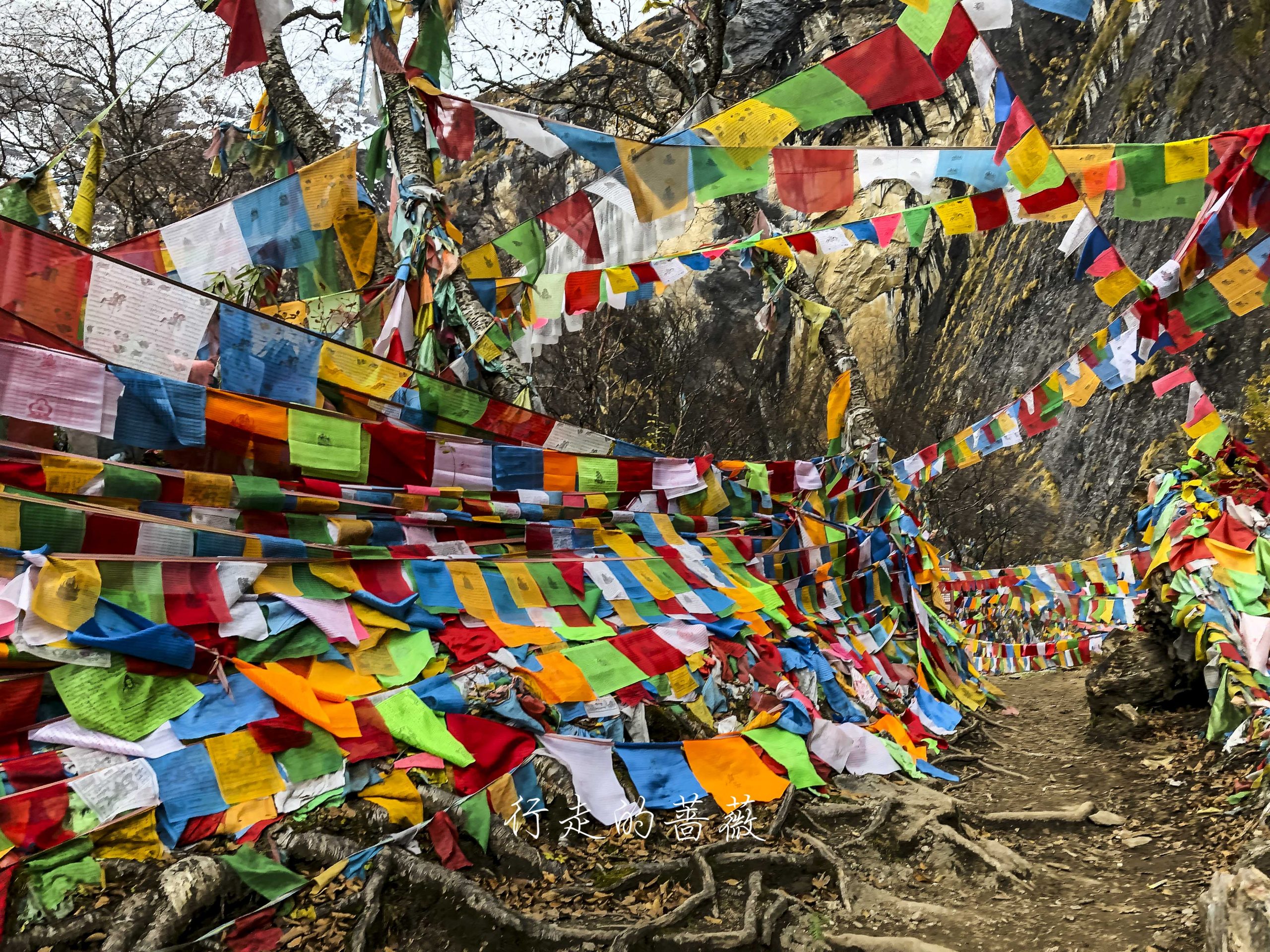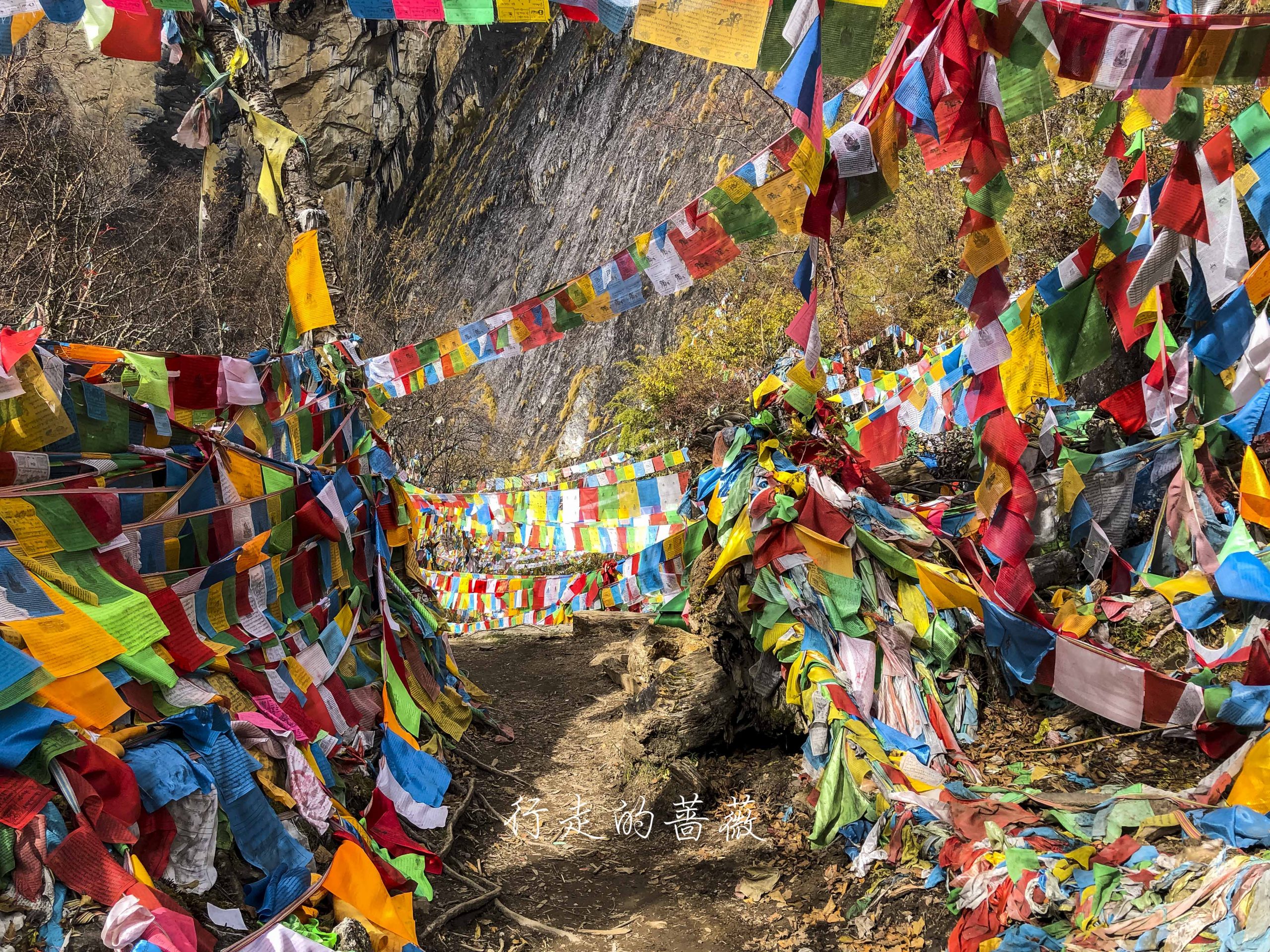 路上非常震撼的是漫山遍野连绵不断的经幡,应该都是藏民来朝圣的时候供奉的。我们沿途也碰到一个藏族家庭,带着年迈的老奶奶一起来神瀑,虽然爬山爬的很辛苦,但是还是坚持到了山顶,信仰的力量是很令人敬佩的。