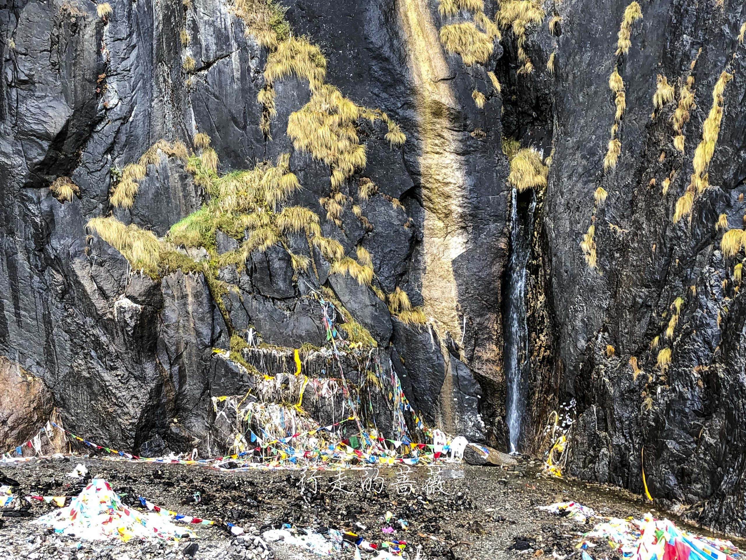 开始的路都挺好走的,就是最后要爬爬爬一段,就能到瀑布了。我们上来大概十点多,还挺快的,歇一会儿吃点东西。之前的藏族家庭已经进行了仪式,接受了神瀑的洗礼了。虽然天还挺冷的,但我们也学着他们在神瀑下冲了一下,绕着走了一圈。神瀑不是那个看着水流比较大的从石头中间出来的这个,而是从天边高处上面落下来的很细的小水流。。。不要戴帽子,才能被神瀑沐浴到。经幡也不要用脚跨过去,要抬起来从头顶过,尊重藏民的传统。