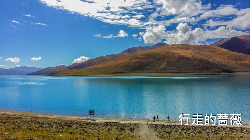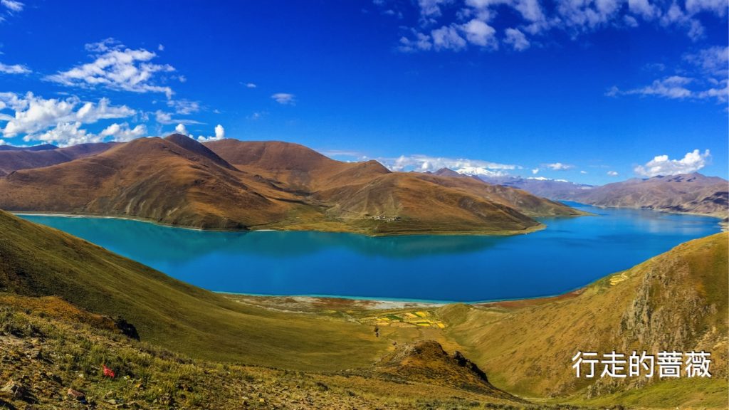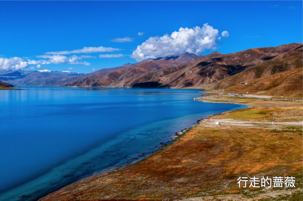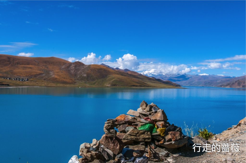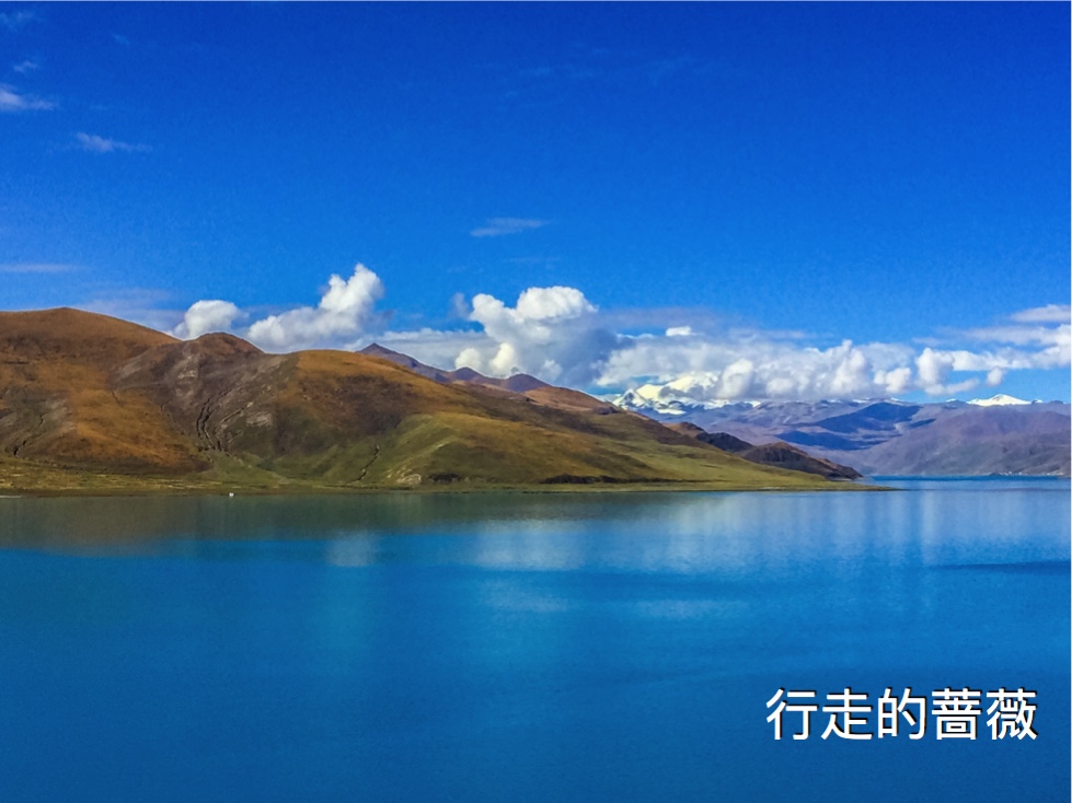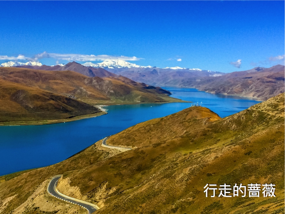 翻越了近五千米的岗巴拉雪山,到达了鼎鼎大名的羊卓雍错–羊湖。作为我们路上看到的第一个措,大家还是很激动的,天蓝蓝水蓝蓝,真的很美。