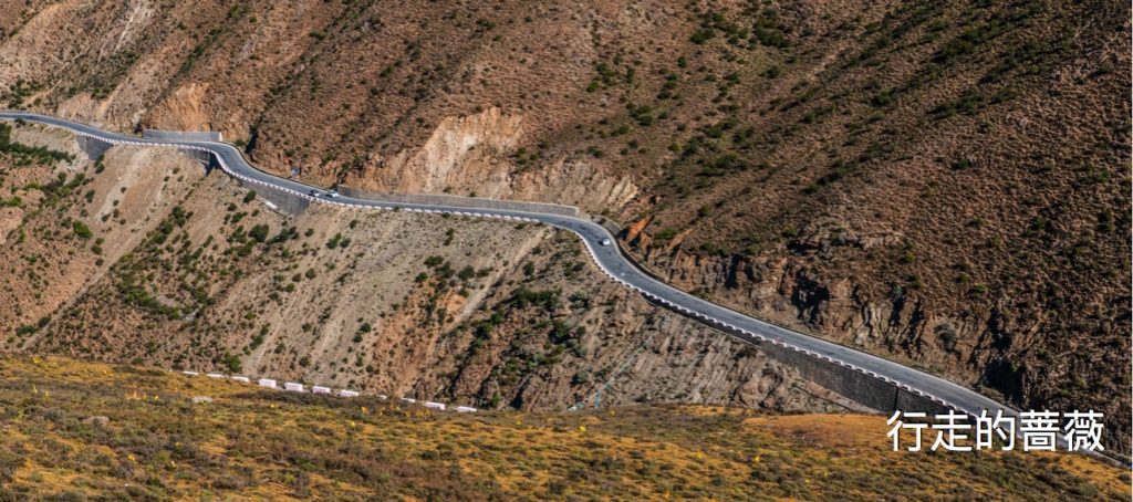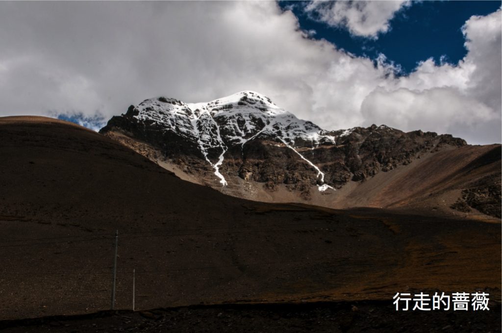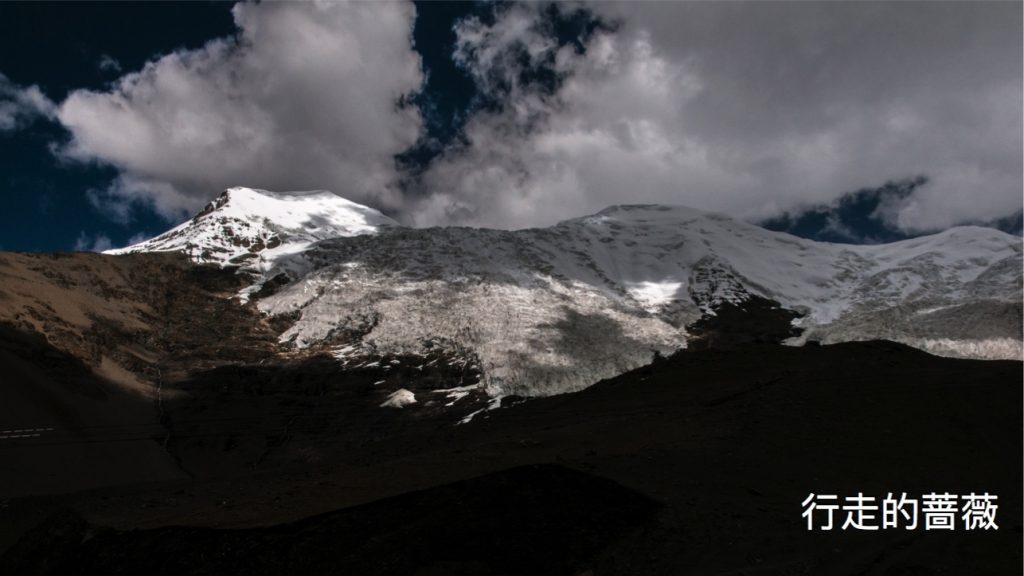 我们没有进入景区,万里说门票很不值得没必要花钱进去,我们在公路上也可以看得到冰川,就随路扫一眼就好。由于长年受公路上灰尘的影响,冰川整体呈黑白分层形态,但挂在山上在阳光的照耀下熠熠生辉也是很壮观的。外面的风有点大,被吹的和鬼似的。