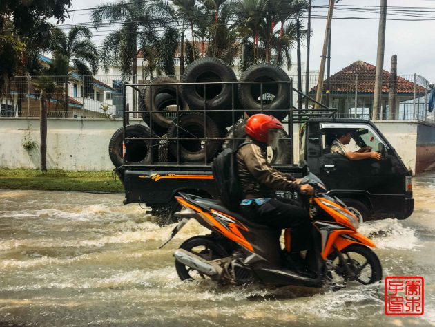 早上临时让工作人员给旅行社打电话,终于来车把我接到Tobali Tour的办公室交钱,等了一会儿十点正式出发。刚出棉兰的时候看见路上都在发大水,可能因为昨晚下雨。路上的学生都脱了鞋袜淌水走路,忽然觉得好心酸。这还不是雨季呢,要是雨季经常下雨可怎么排水啊。