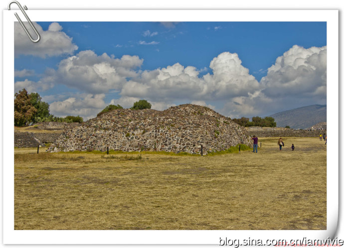 我们就沿着亡灵大道(Calzada de los Muertos)一直向太阳金字塔进发。大道两边都是些小型的Talud-tablero建筑风格的遗址,阿兹泰克人认为这些是陵墓,后来的学者认为是用来祭祀的。这也是埃及金字塔和这里金字塔的差别,埃及的是陵墓,这边大部分是用来祭祀的平台。