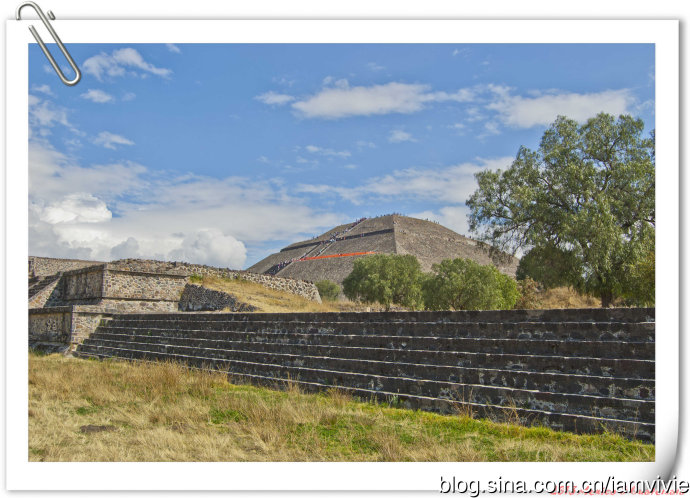 离太阳金字塔越来越近了,能看到像蚂蚁一样在攀爬金字塔的人们。