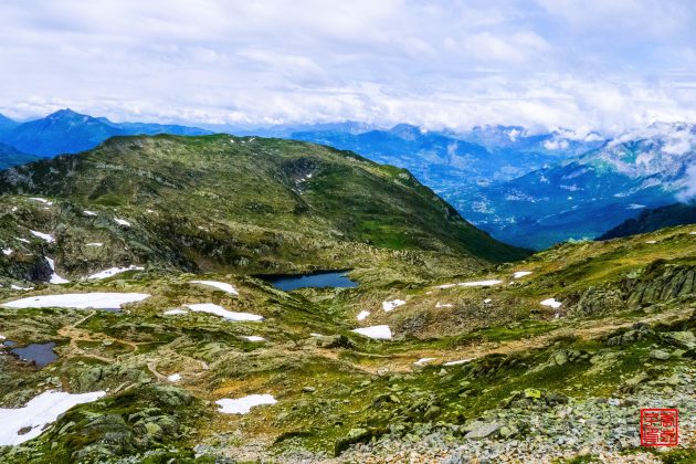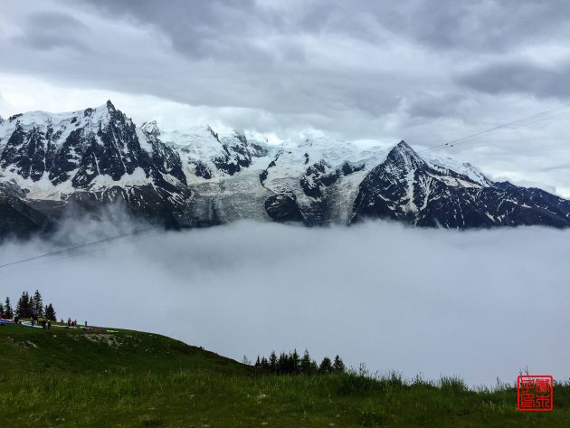 第一天,目的地是Les Houches,我们先做缆车到达海拔2526的Le Brevent山顶,这里是以能看见勃朗峰的完整正面全景而著称,但今天云层太厚,勃朗峰没看到但是云海很不错,云雾缭绕,山顶上还有很多积雪要穿越,六月还是有点早。