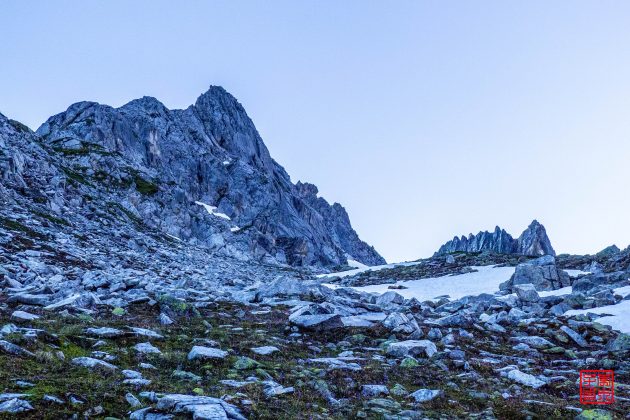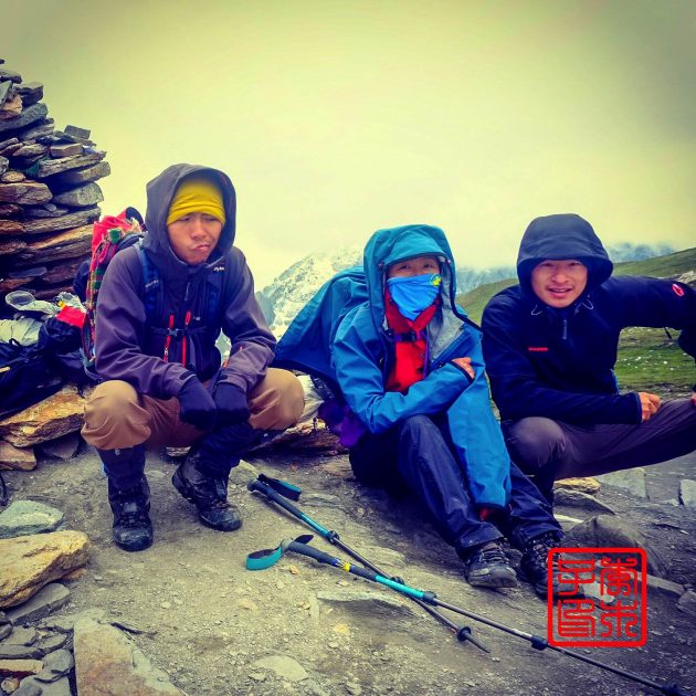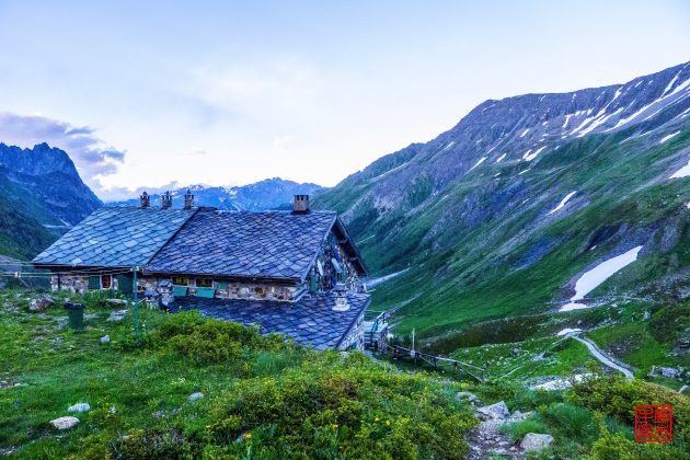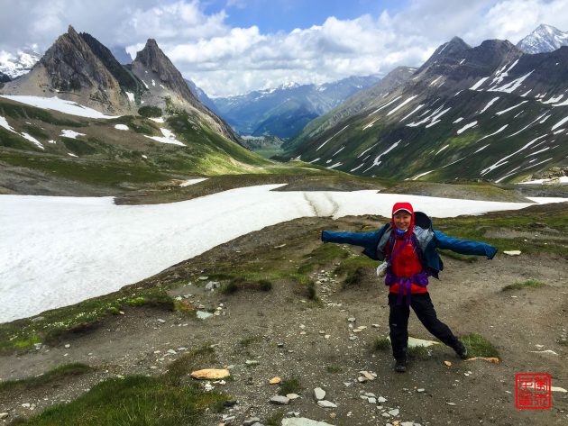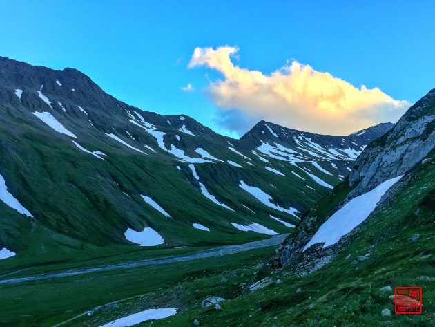 环勃朗峰徒步第四天,出门有点雨雪交加,赶紧都全身武装起来。先是从两千多米下降到1554m的Les Chapieux,之后就开始爬今天最高点的山口Col de la Seigne海拔2516m。