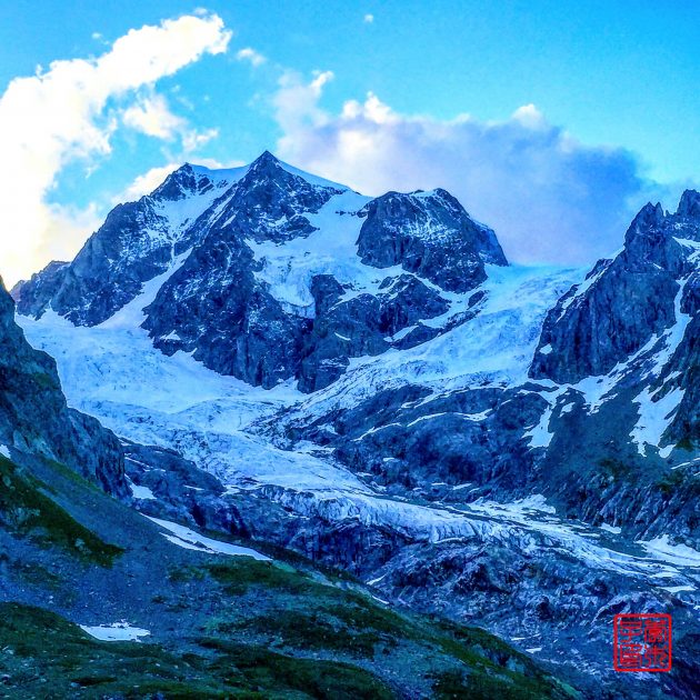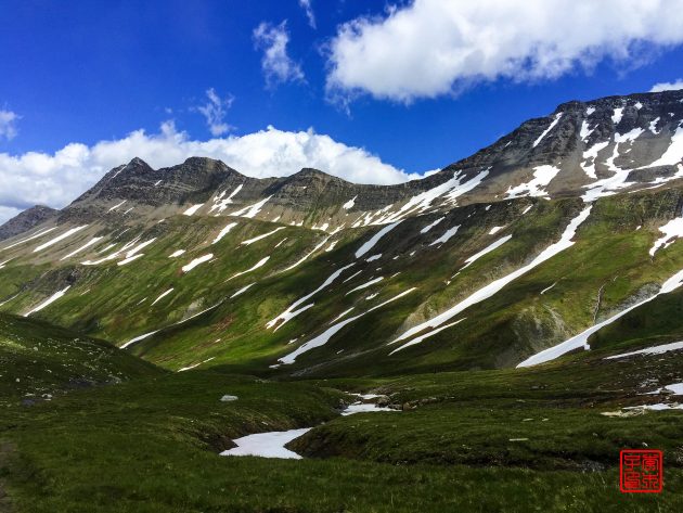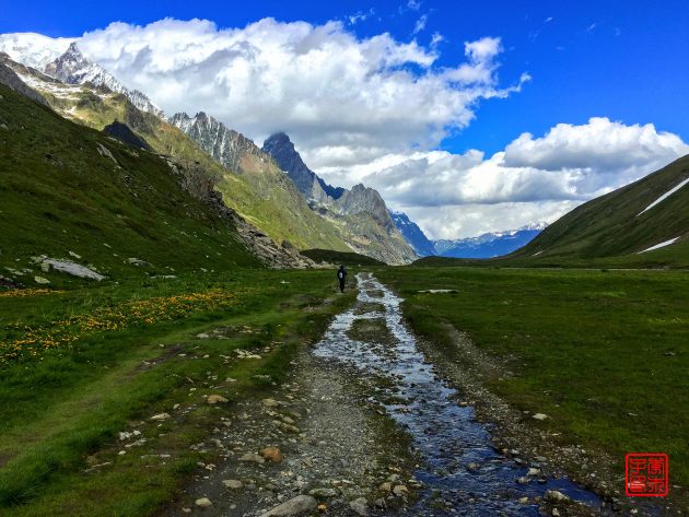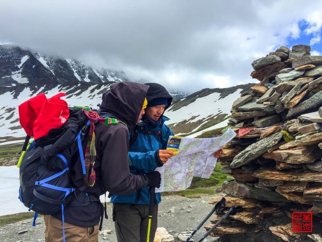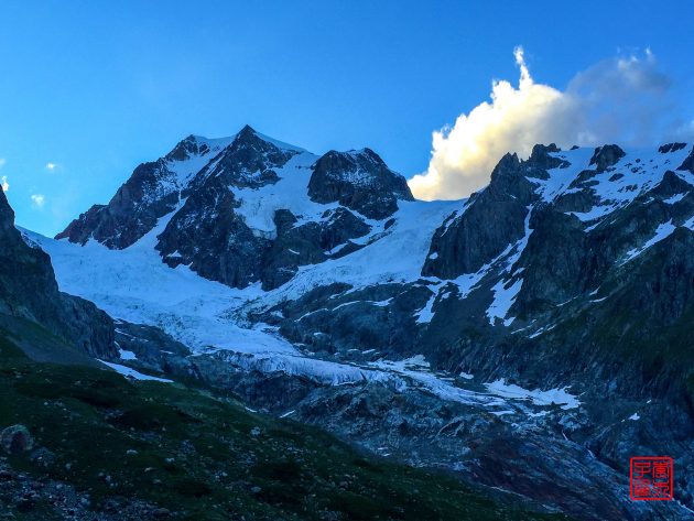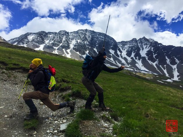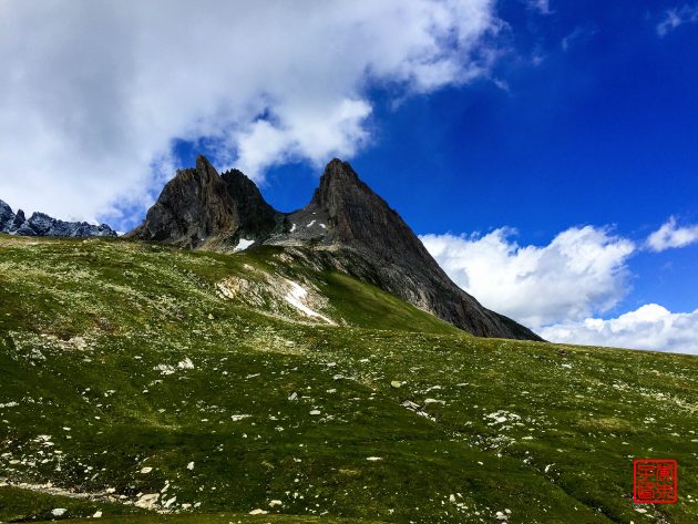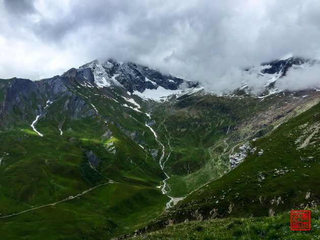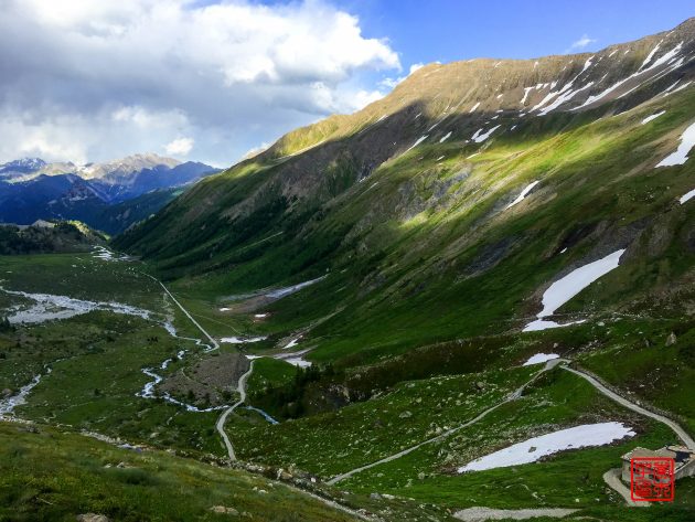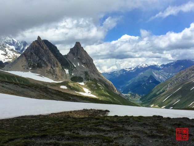 山口冷风嗖嗖的,James把他昂贵的高级冲锋衣借我穿,装备控们伤不起呀,户外又是一个无底的黑洞。翻过这个山口就进入意大利了,从bonjour变成了bonjourno~这里也应该是看勃朗峰的好位置,云层太厚没看到耶。
