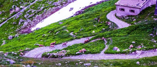 忽然门口来了一群野山羊,占领了门口的小房子,看上去很有组织有纪律,有个领头的羊先到了探路,然后一直站在屋顶望风,直到大部队都到了。感觉大自然好和谐,野山羊就这么住在离我们山屋的近在咫尺的另一栋房子里,和我们成了邻居?
