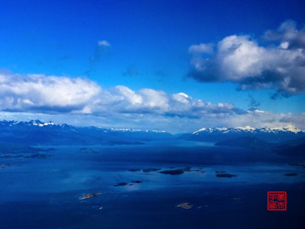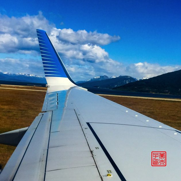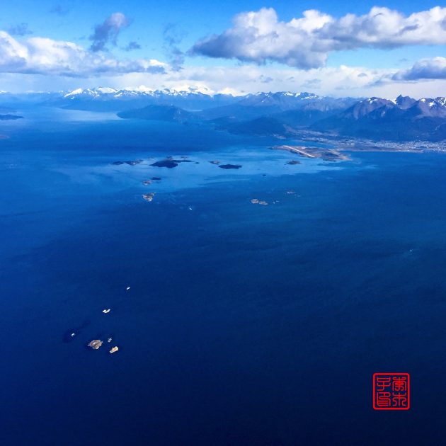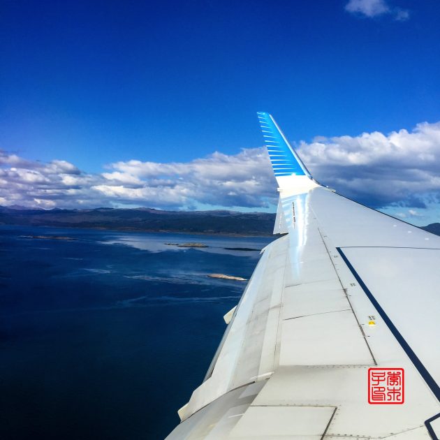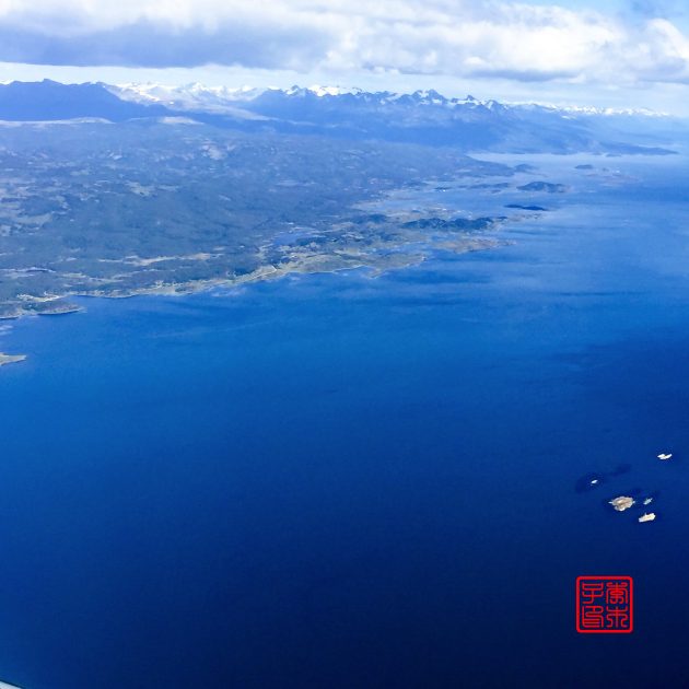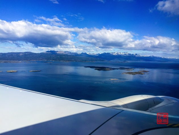 路上看到的是伴随着远处连绵雪山的深蓝色的大海。乌斯怀亚的机场离市区不太远,是在伸出到比格尔海峡的一个半岛上。