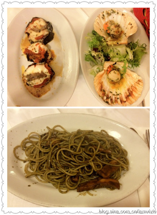 回到主岛,晚餐是打算吃威尼斯著名的墨鱼面的,幸好想去的这一家非常容易的就找到了。Alla Rivetta, Ponte San Provolo 4625,基本就在桥的下面的角落里,没看到门牌号,旁边那一家号码是相邻的,我们就肯定了应该是这一家了。我看别人说是LP推荐的,不过我的LP没写这一家,不知道是哪一本的推荐。他家店不是很大,墨鱼面不错的,我们还一人点了一个烤扇贝,还有茄子拼盘。不是很喜欢服务员拼命向你推销食物的态度,我不想吃别和我欠你钱似的脸好吧。不过东西都非常好吃,可是就是外面的河水有腐臭味道,不时的飘进店里。。。我们吃完赶紧逃出二里地远,才深深呼吸了一把哎。
