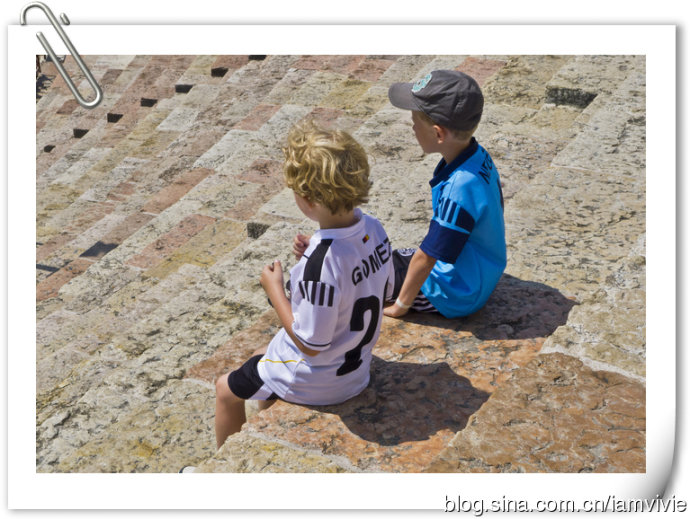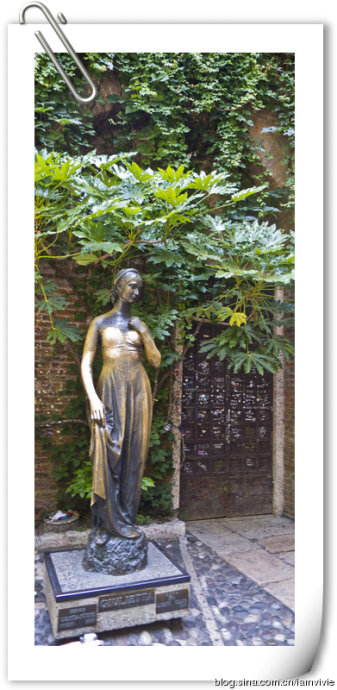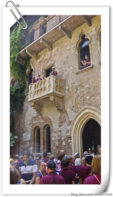 斗兽场出来下一站是著名的朱丽叶阳台。其实据说罗密欧与朱丽叶本来的故事背景是锡耶纳也不是维罗纳,而且也没有朱丽叶的故居,可是为了不让广大的爱好者失望,就建造了朱丽叶故居,还有那个最著名的朱丽叶的阳台,罗密欧就在阳台下面追求朱丽叶的。故居院子里人非常多,我们没有买票进去,就在院子里看看,朱丽叶的阳台上挤满了人,也不好拍照。故居入口的墙上写满了人们爱的宣言,最搞笑的是这个胡锦涛和马英九的,看得我们笑得不行。旁边纪念品商店逛逛,买了罗密欧和朱丽叶的书签还有一个布包,想说沾沾喜气来电桃花运,哈哈。