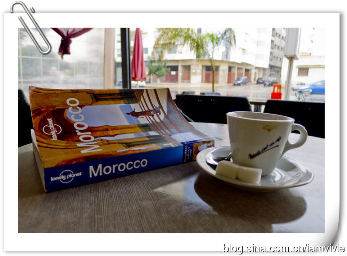 出了火车站,看了看地图,LP上说要去一个叫Institut Francais的地方拼车去圣城。我没做功课没下载地图,LP地图只有大概方向,不是很清晰该怎么摸过去。据说梅克内斯相比菲斯马拉喀什什么的旅游城市民风淳朴多了,所以可以放心大胆的向陌生人问路。在车站问了一个小姑娘怎么去,小姑娘一听说我要去哪里,很不敢相信的说,你要坐公共汽车才行,走过去太远了,然后告诉我在哪里坐车。我看了看LP地图,貌似最多两千米啊,真的要坐车吗?等了一会儿公车也没来,就按照公车方向徒步了。路上又抓了一个大妈问路,大妈大概给我指了一下方向。我没走几步,就开始下暴雨,虽然我带伞了,不过这雨下的,打伞也没用吧。在路边修车站躲了一会儿雨,发现好像没有要停的迹象,张望了一下路口有个咖啡店,就过去坐下点了杯咖啡坐下避雨。不是旅游城市就是不一样,一杯咖啡才7迪拉姆!终于有时间读一下LP了~~