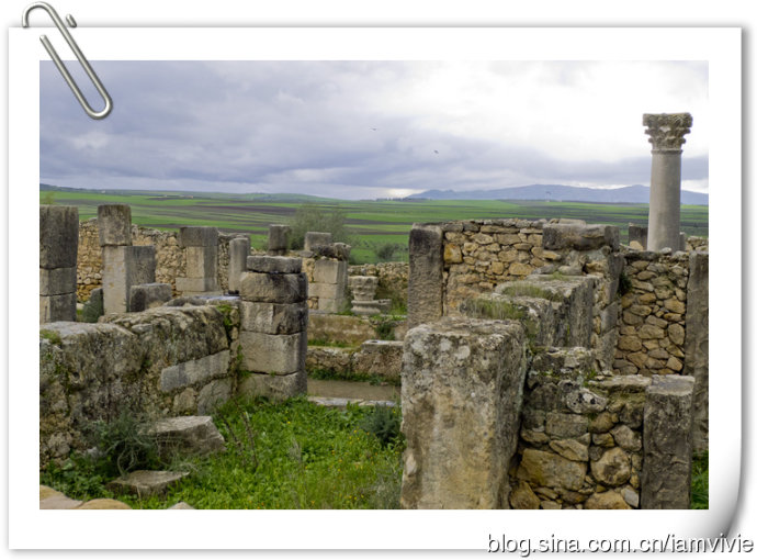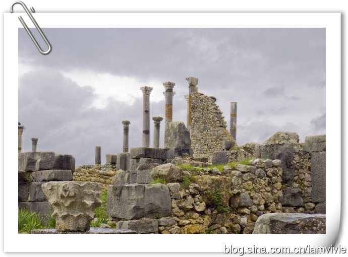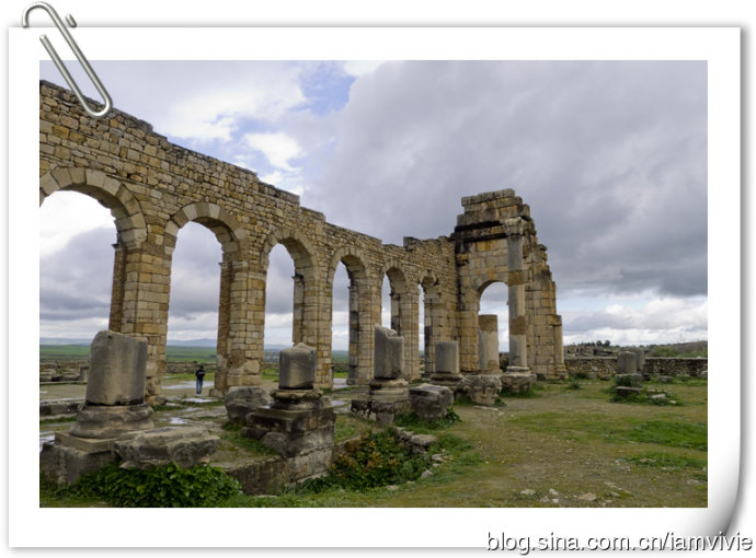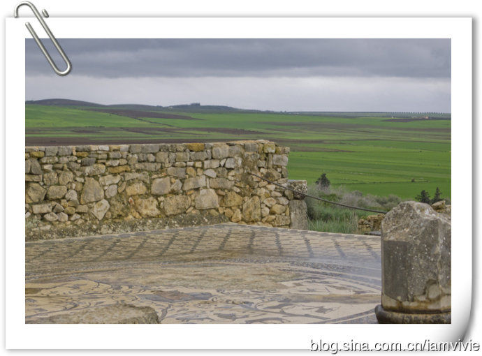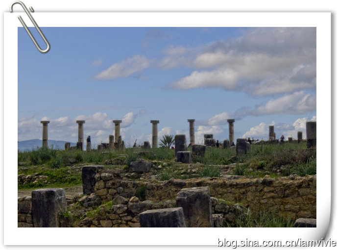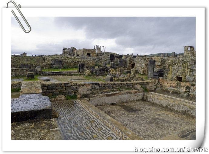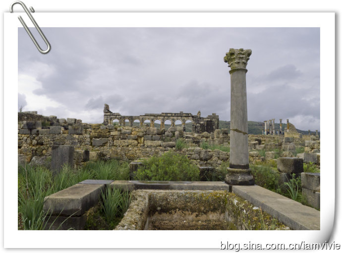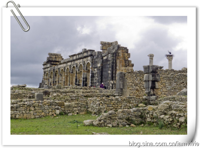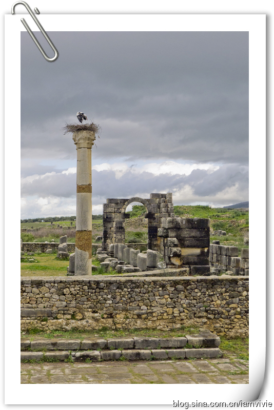 这个罗马遗址建造于公元前三世纪,公元后一世纪以后开始扩张,之后有好多的族裔生活在这里。罗马帝国后来也没有重新收回这个地方,因为距离太远了不容易防守。这座城市一直保存完好,直到十八世纪中的大地震受到了破坏,之后统治者把这里洗劫了,石头运到梅克内斯重新使用去建造房子。十九世纪后期这个遗址才引起世人注意,摩洛哥被法国统制的时期进行了挖掘,发现了精美的马赛克图和房屋什么的,1997年被加入世界遗产,这里就越来越有名了。默罕默德尽职尽责的给我介绍了很多知识,这里是什么什么屋子,那里是什么什么地方,我也记不住那么多,只觉的古罗马也太繁华了!最印象深刻的是一个柱子上的一只大鸟,鸟巢也很大,据说还有一只也是常年驻扎在这里的,不过当天不知道去哪里了。